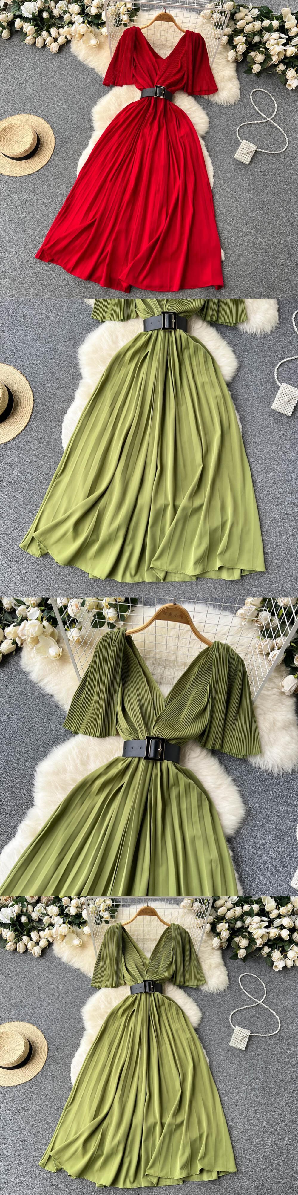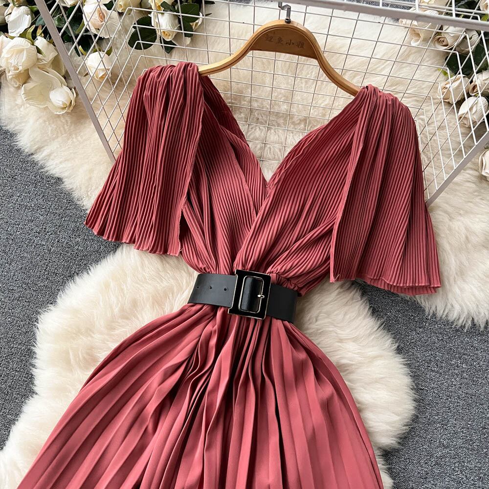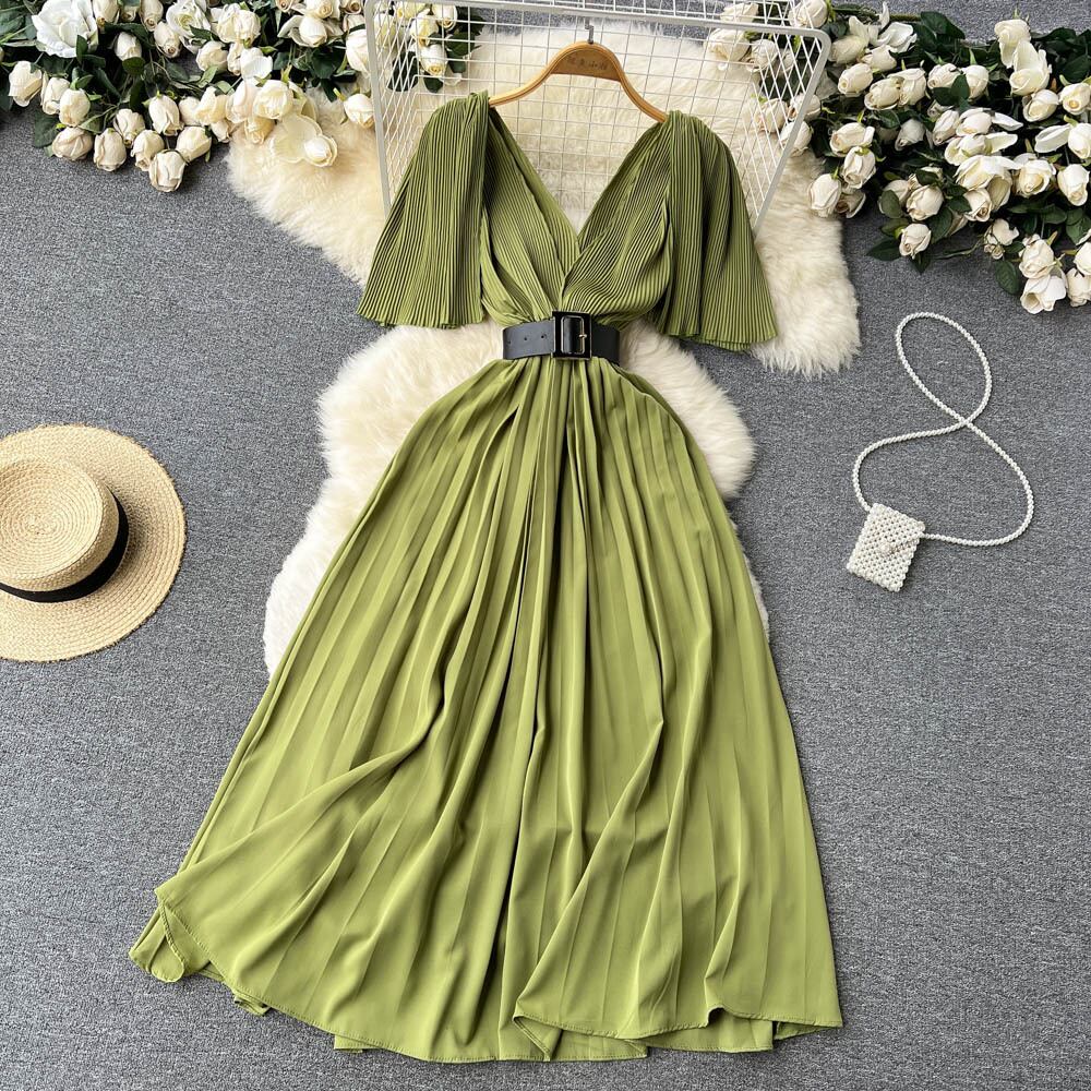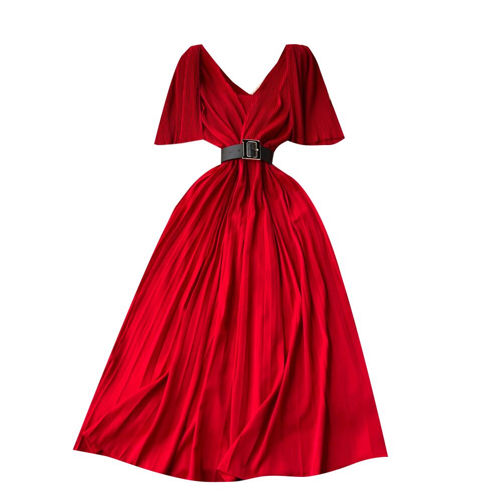 重工業プリーツスリムロングホリデースタイルシフォンプリーツロングスカート無地気質Vネックフレンチスーパーフェアリードレス ソリッドカラー lyxaj21718871299