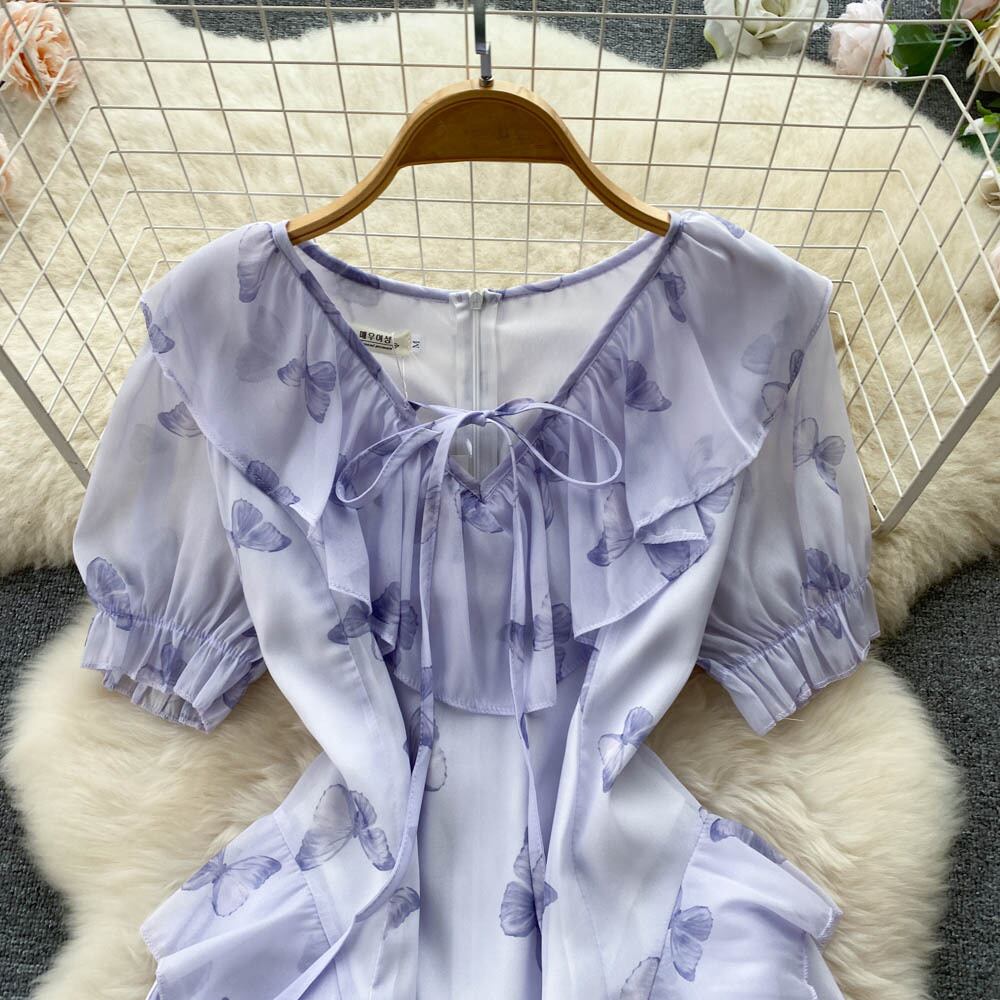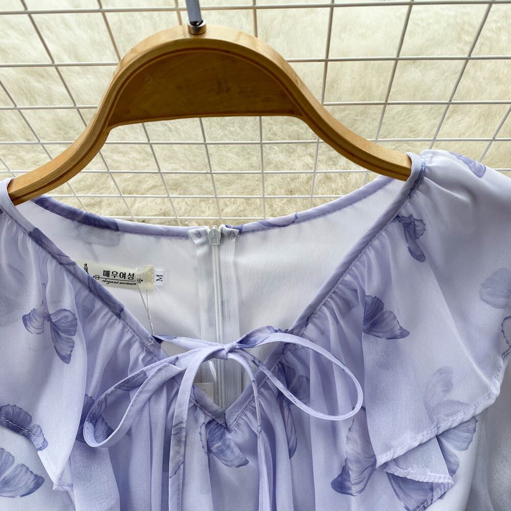 優しい風紫花柄ワンピース女性夏パフ袖ウエストスリムVネックミドル丈気質フェアリースカート サマー 夏物 パープル lyxaj37720905624