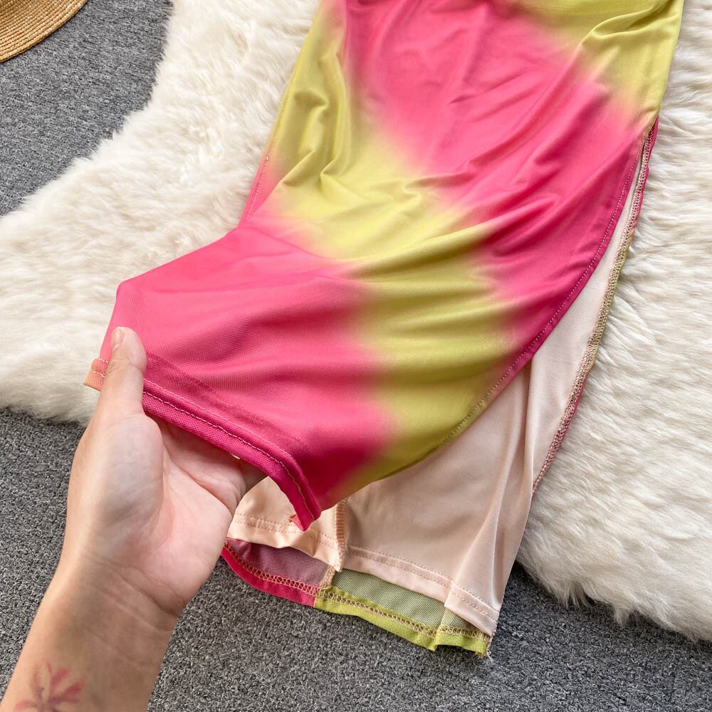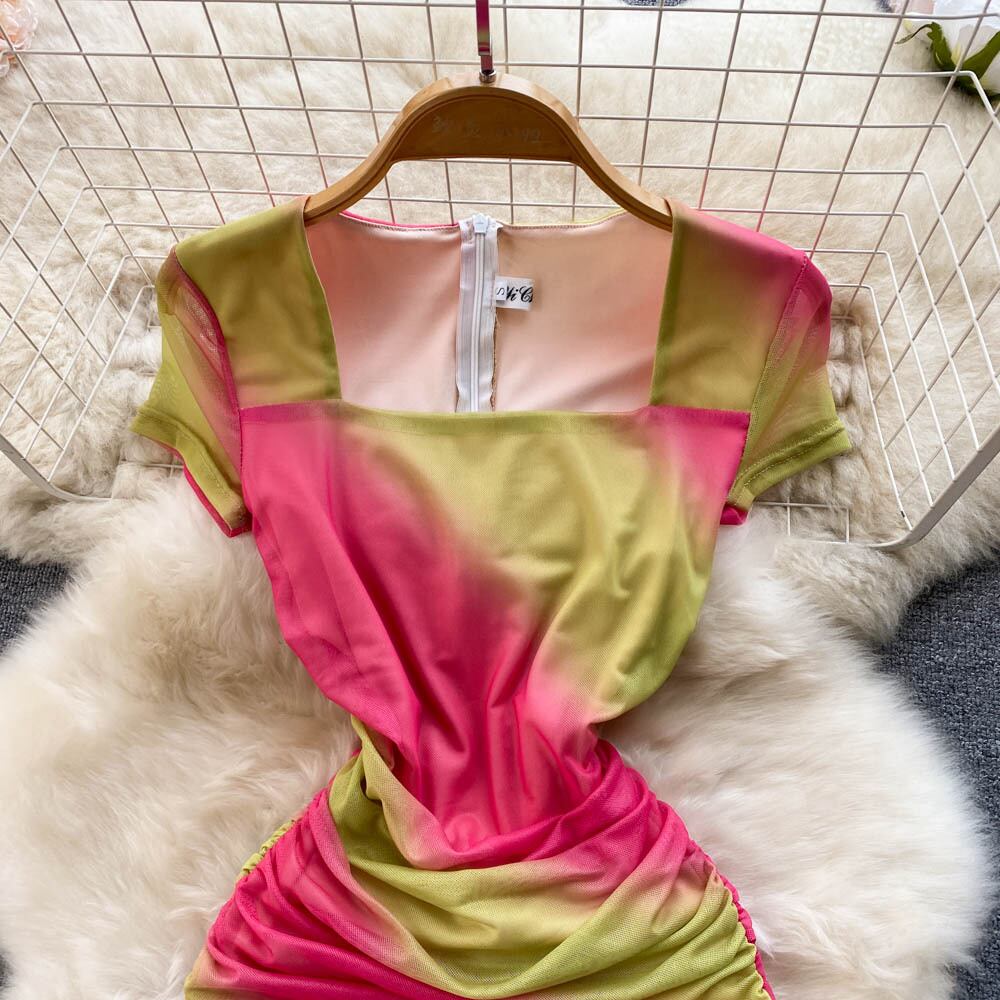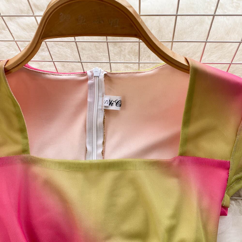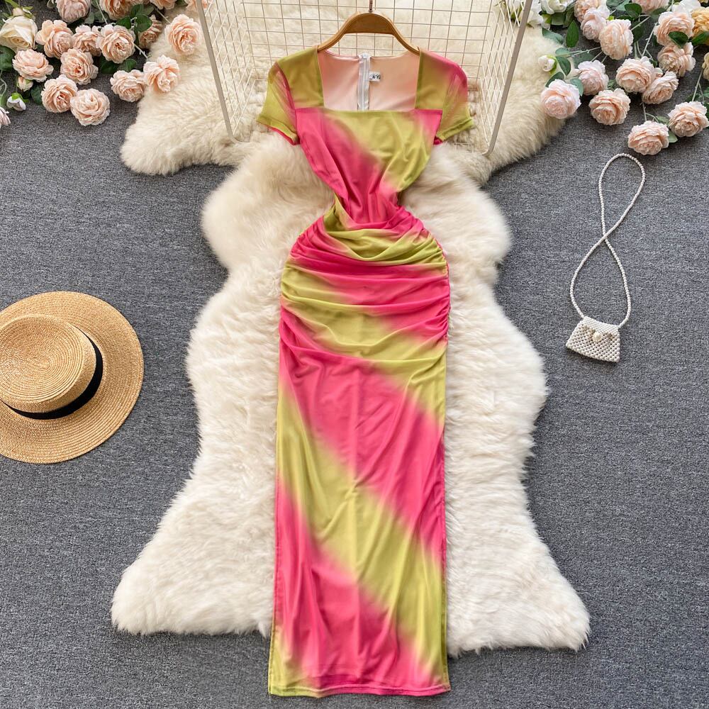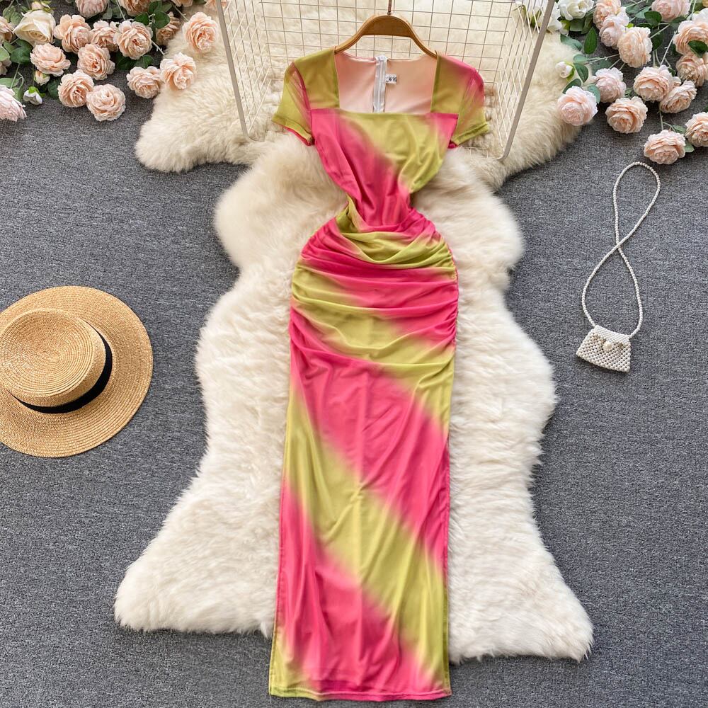 ネットレッドセクシーなホットな女の子のスクエアネックプリーツスリムグラデーションメッシュドレス女性の夏の新しいバッグヒップロングスカート サマー 夏物 スクウェア lyxaj44827746579