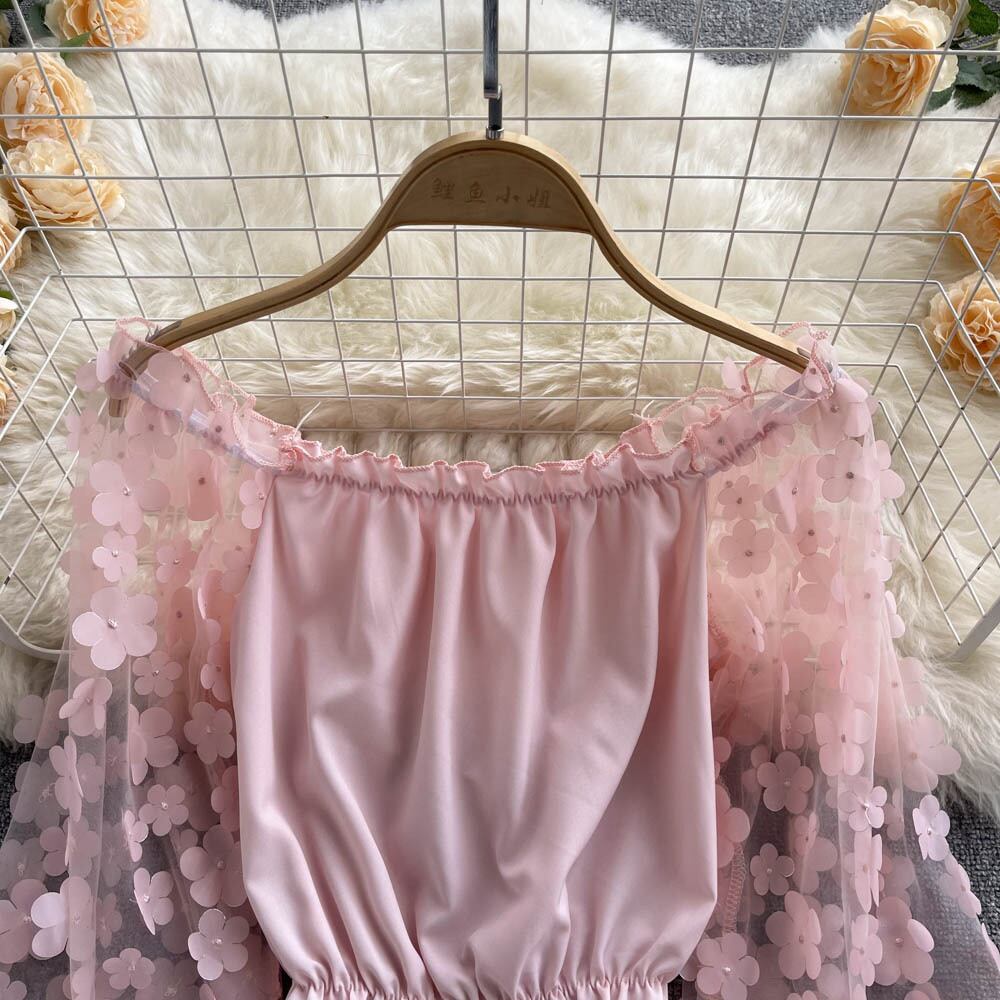 ワードネックショート気質シャツレディースデザインセンスニッチウエストスリミングメッシュフラワーパフスリーブトップの韓国版 フラワーデザイン lyxaj5726769573