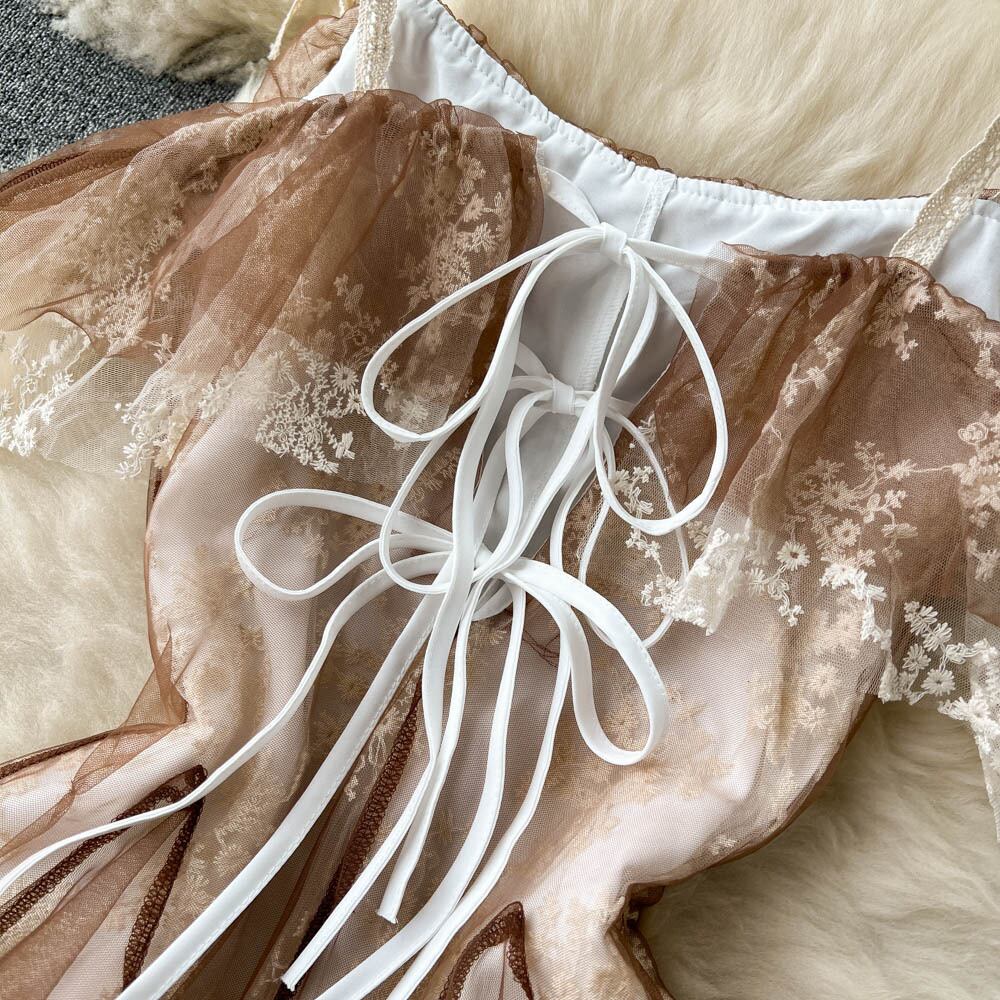 フランスのレトロなティーブレイクスウィートメッシュドレススーパーフェアリー気質ストラップVネックピュアデザイアサスペンダーミドル丈スカート 大人ガーリー キュート カジュアル lyxaj82102491696