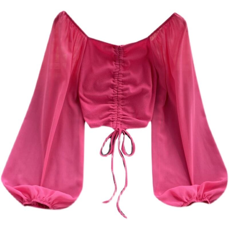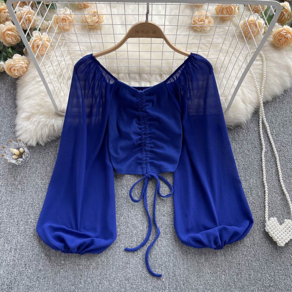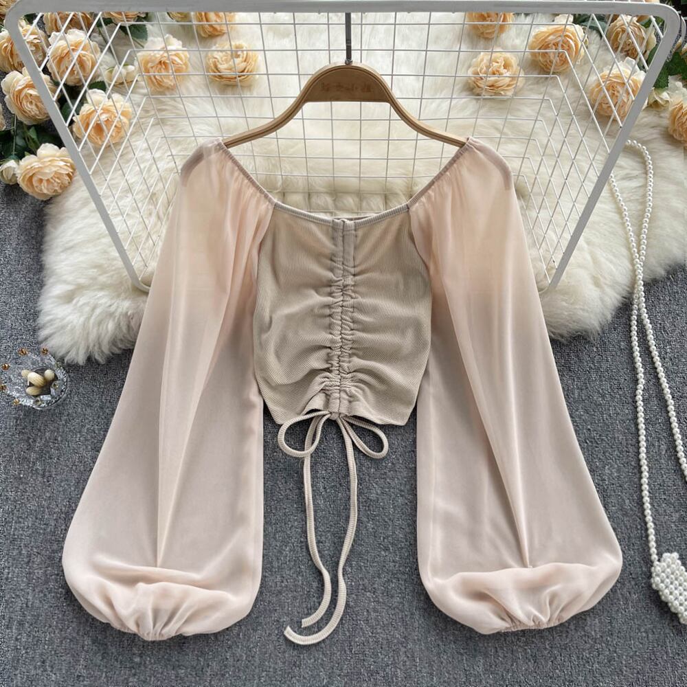 甘いワードネックバブル長袖シャツ2022年夏の新しいプリーツレースアップスリムショート気質トップ ロング 大人ガーリー スウィート キュート カジュアル サマー 夏物 lyxaj12096107659