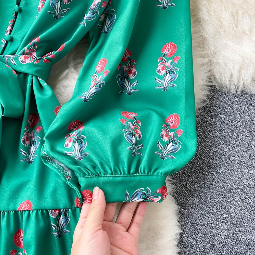 森スーパーフェアリースカートグリーンシフォンワンピース春夏新気質Vネックミドル丈ベルフラワースカートトレンディ スプリング 春物 サマー 夏物 フラワーデザイン lyxaj23428033888