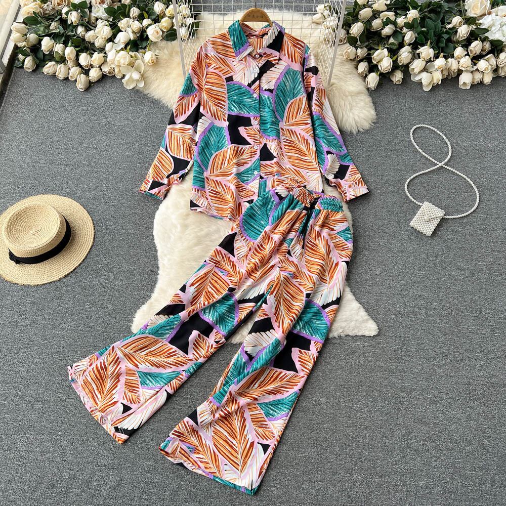 気質セレブスーツ女性ホリデースタイルウエスタンプリントルーズ長袖シャツハイウエストワイドレッグパンツファッショナブルなツーピーススーツ ハイウェスト ロング ワイドパンツ lyxaj64611775392