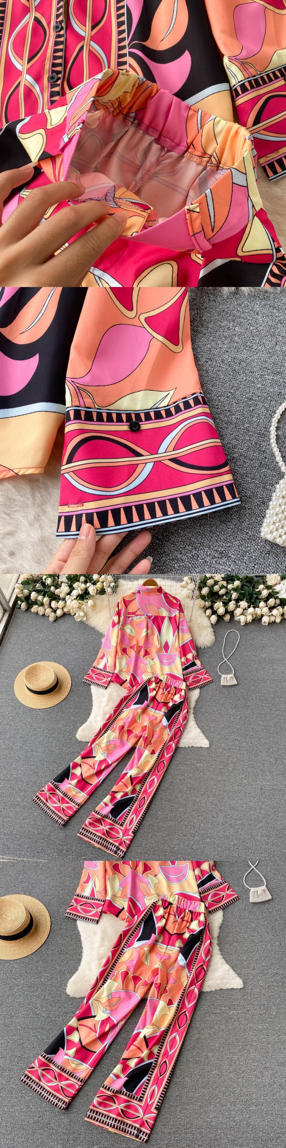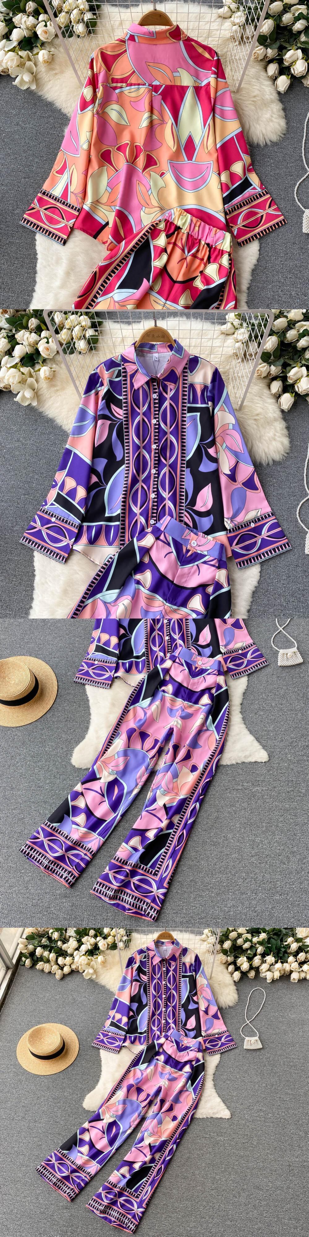 気質セレブスーツ女性春秋新作ルーズ長袖プリントシャツハイウエストカジュアルワイドレッグパンツツーピースセット ロング スプリング 春物 オータム 秋物 lyxaj24669245139