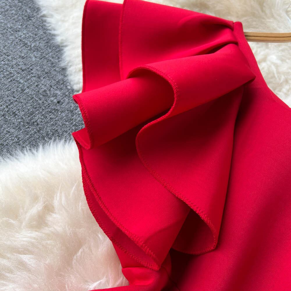 気質無地レディーススカート女性ニッチデザインセンスの蓮の葉袖ウエストスリムストレートドレストレンディの韓国版 ソリッドカラー lyxaj51630535955