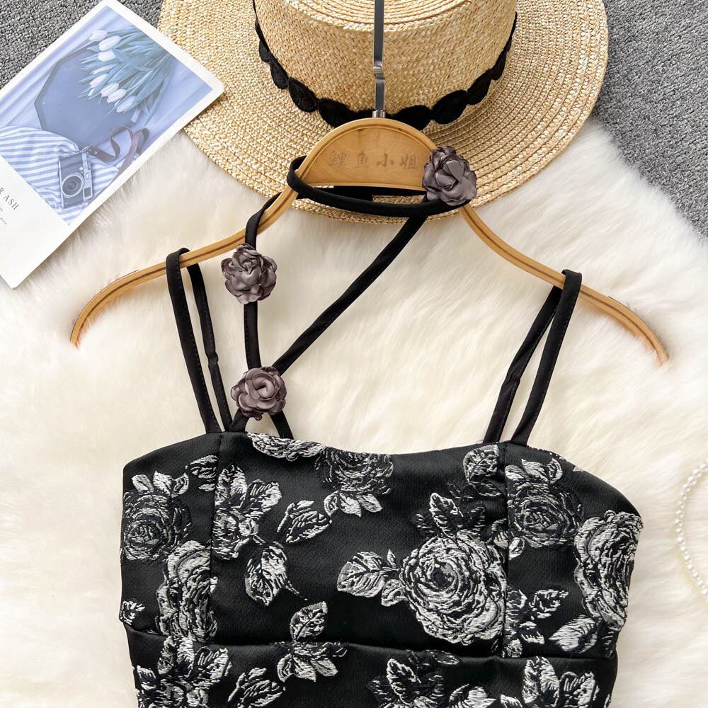 キャミソールレディースレトロジャカードスリムフィットショートスキームホルターネック立体フラワートップファッショナブルオールマッチアウタートップ フラワーデザイン lyxaj58919351413