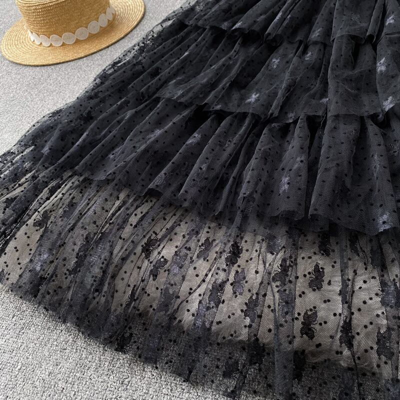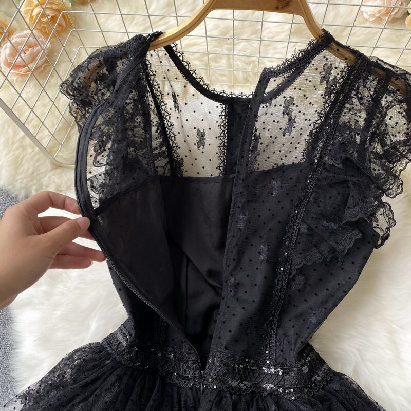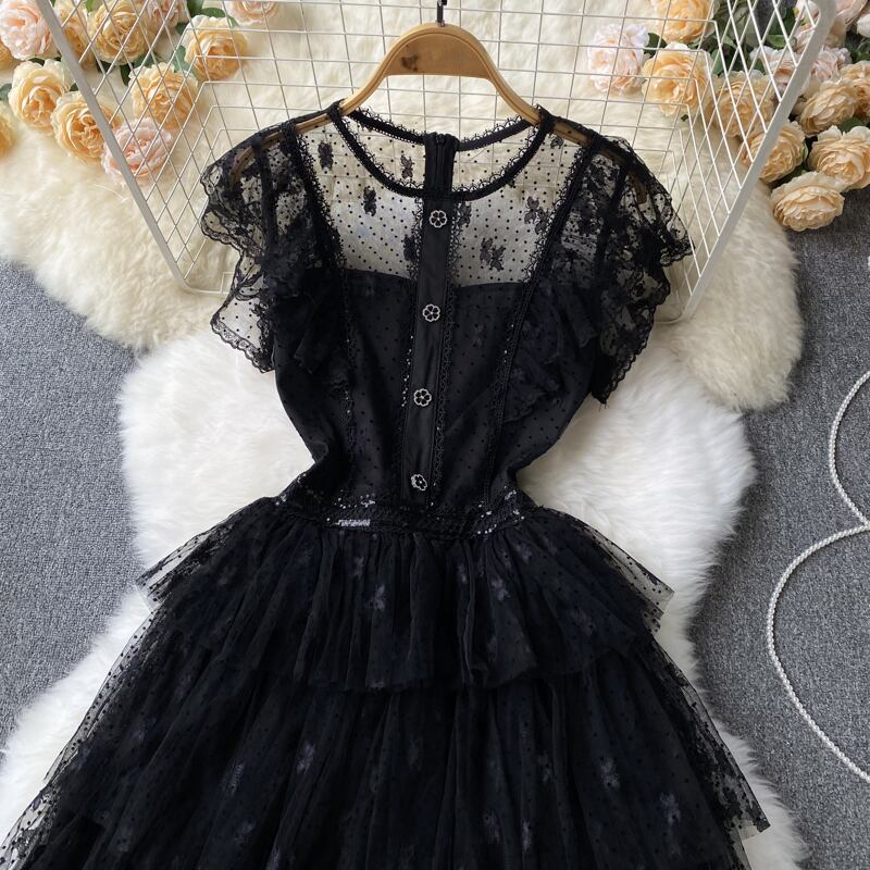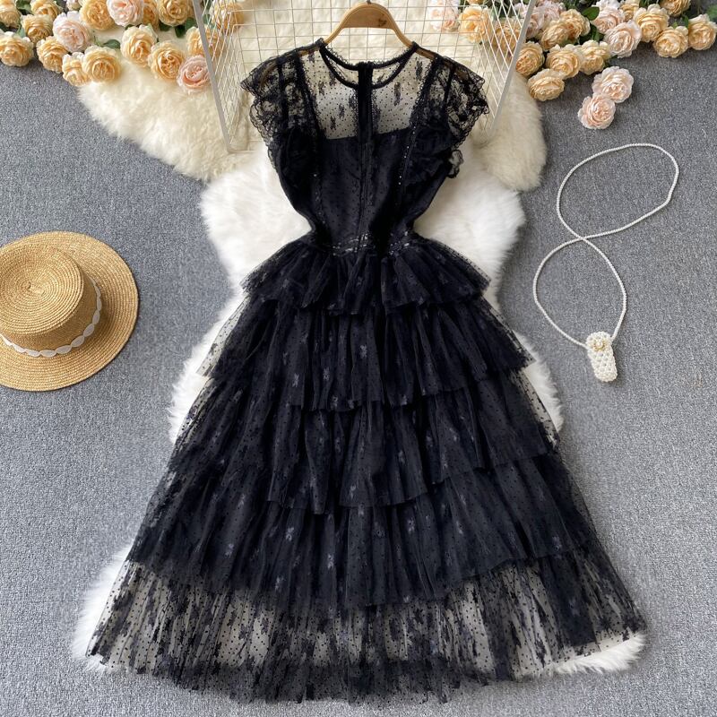 レトロなヘップバーンスタイルのリトルブラックドレス2022新しいフレンチスウィート初恋気質ウエストメッシュケーキドレス女性 大人ガーリー キュート カジュアル lyxaj97440635001