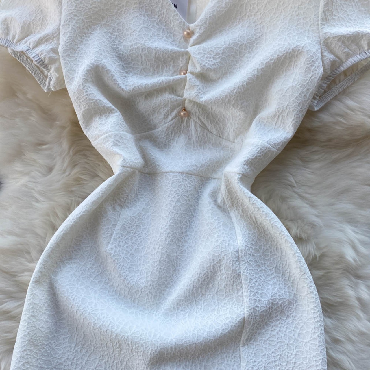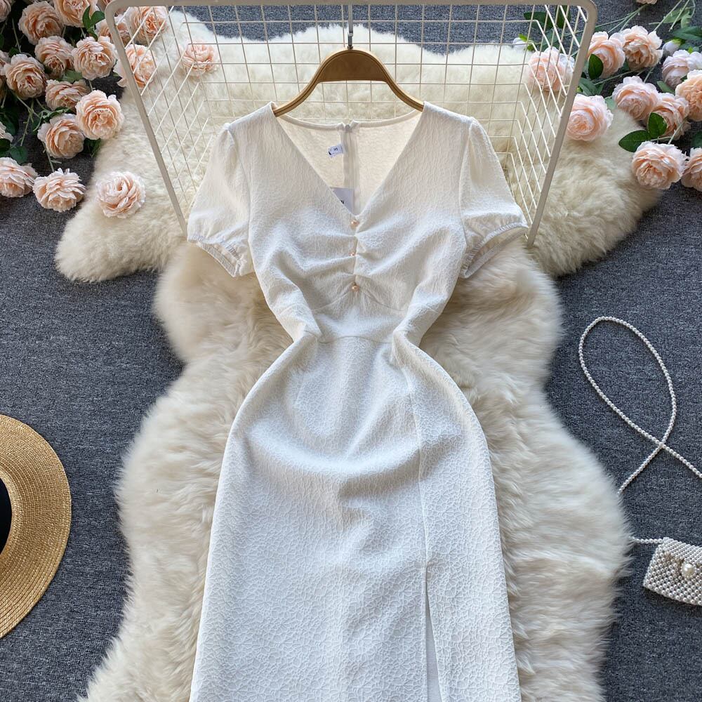 韓国語版シックな夏の新しいレトロなVネックプリーツバブル半袖Aラインスカートルーズミドル丈スリットドレス サマー 夏物 lyxaj60775003418