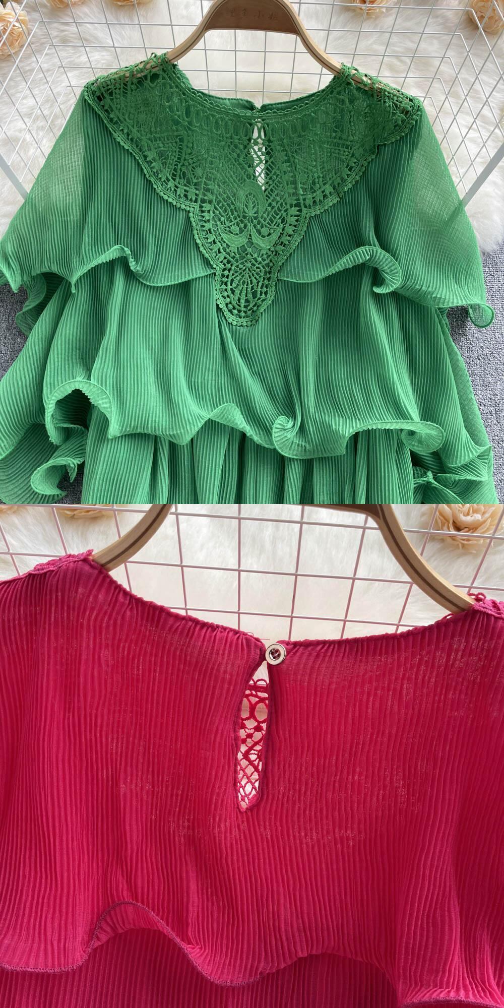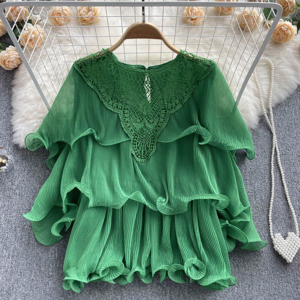 ヨーロッパとアメリカンスタイルのインファッショナブルな外国スタイルのラウンドネックロータスリーフエッジステッチレースレディースデザインセンスルーズプリーツシフォンシャツ Oネック ヨーロピアン lyxaj67105184708