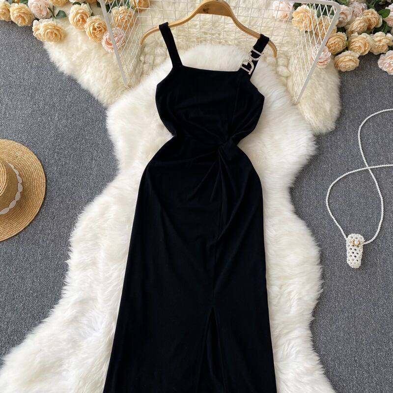 2022年夏の黒のサスペンダードレス女性のウエストスリミングスリムハイウエストスリットバッグヒップ気質小さな黒のスカート ハイウェスト ブラック サマー 夏物 lyxaj7407904486