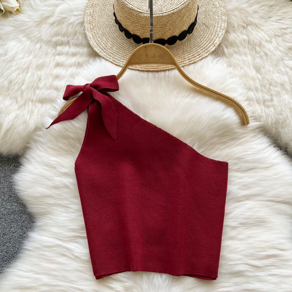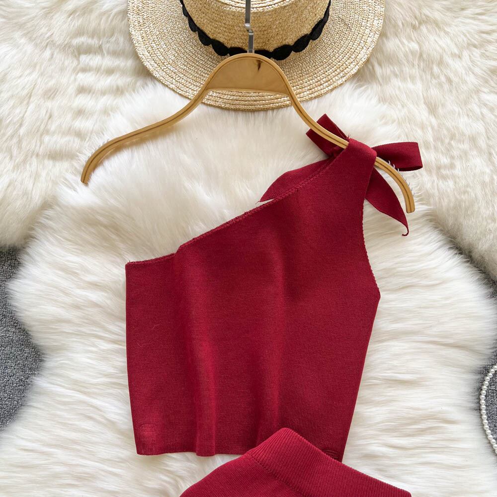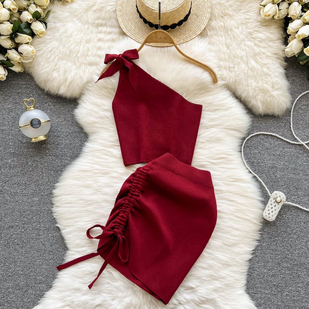 夏の新作韓国風レースアップスラントショルダーオフウエストショートトップスモックハイウエストバッグヒップスカートニットツーピーススーツタイド ハイウェスト サマー 夏物 lyxaj88227093911