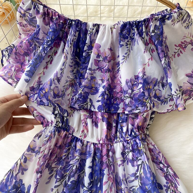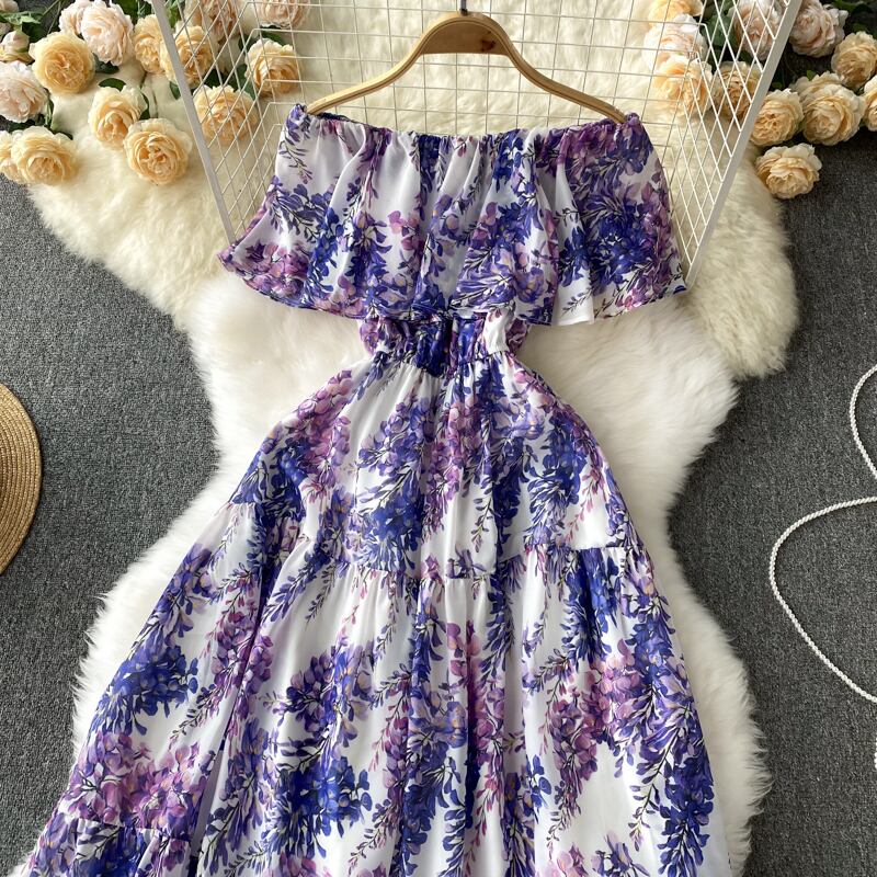 セクシーなオフショルダーのワードネックフリルウエストミドル丈シフォンフローラルホリデードレスレディースサマーニュースタイル 夏物 花柄 lyxaj10253549736