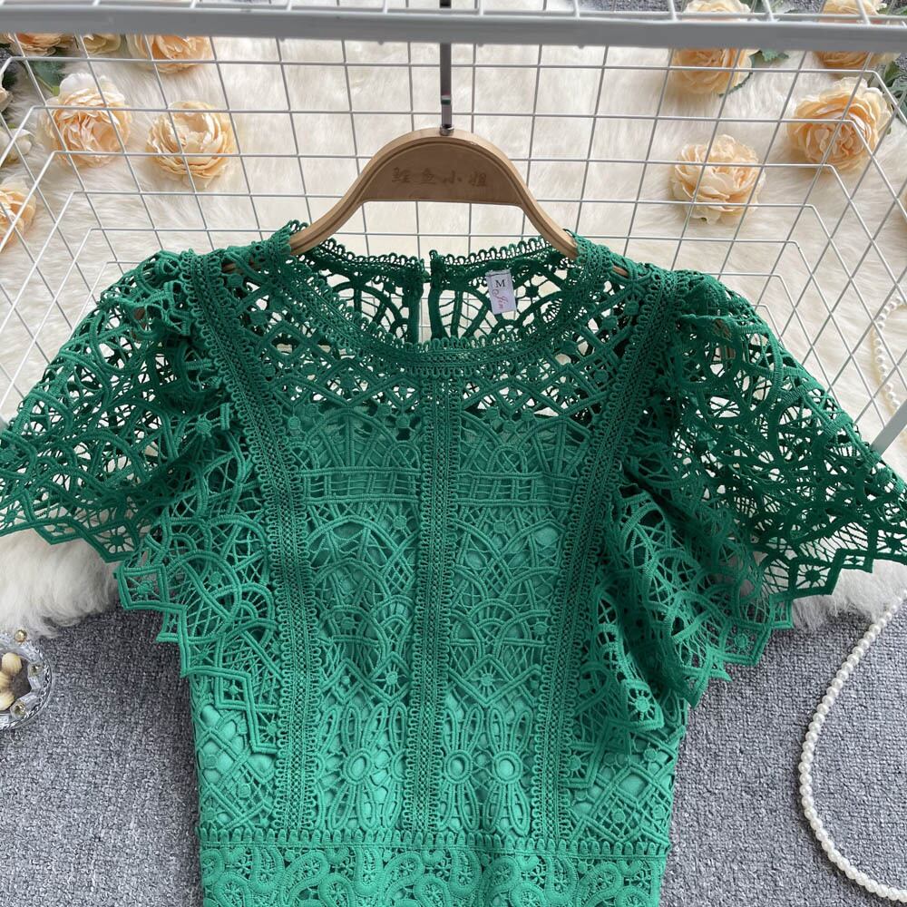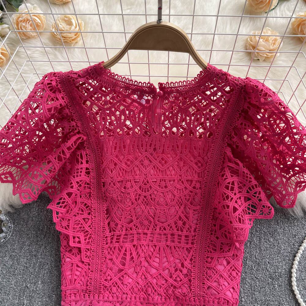 2022年夏のニッチなデザインセンスの韓国版、くぼみ、ハイウエスト、薄手のフライングスリーブ、ショートレースシャツ、女性のトレンド ハイウェスト サマー 夏物 lyxaj45704202158