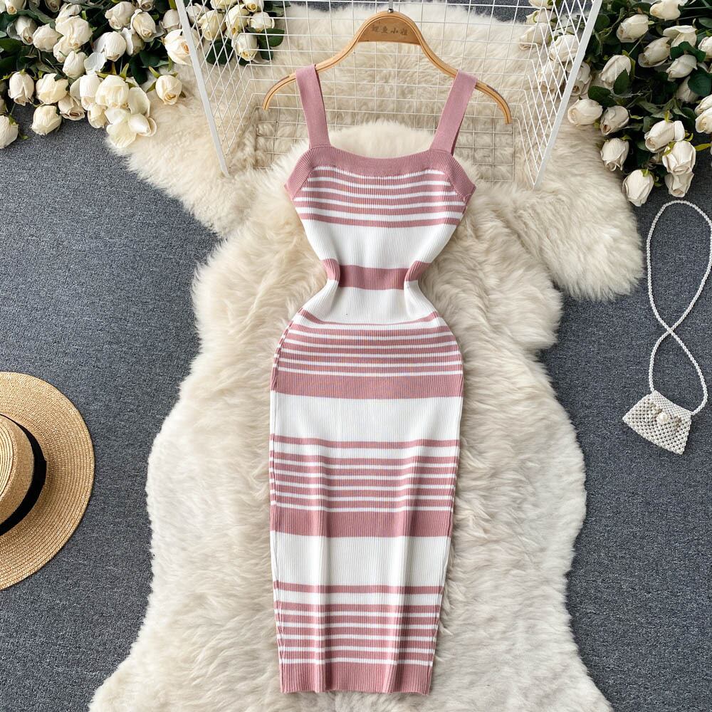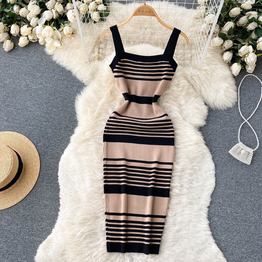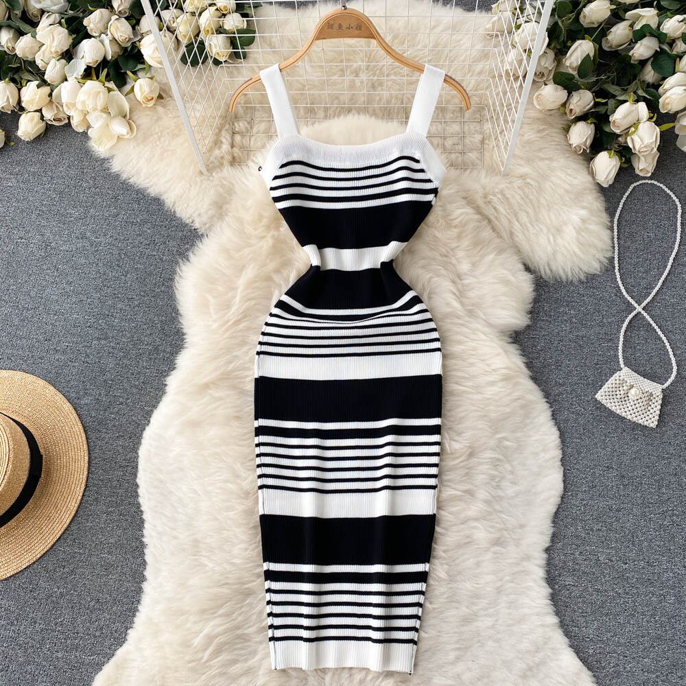 韓国版シックなノースリーブベストニットワンピースレディースサマー伸縮性タイトフィット薄手のストライプヒップボトミングスカート エラスティック 夏物 lyxaj19026334362