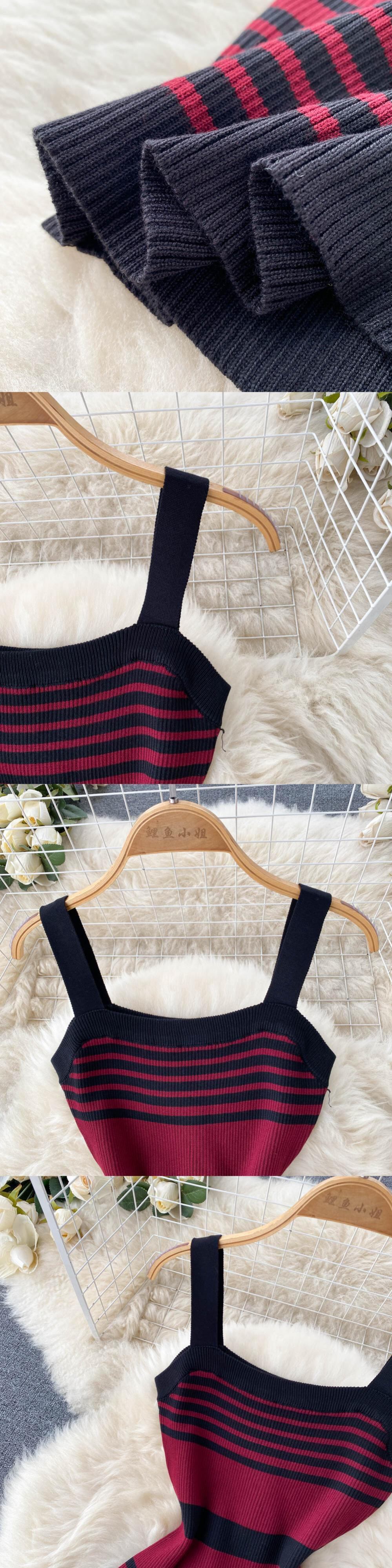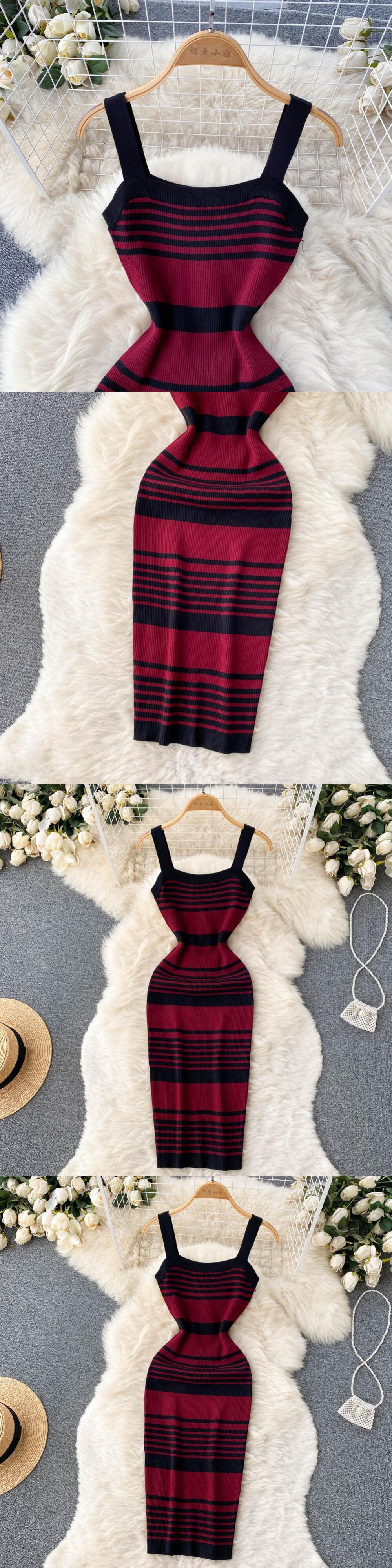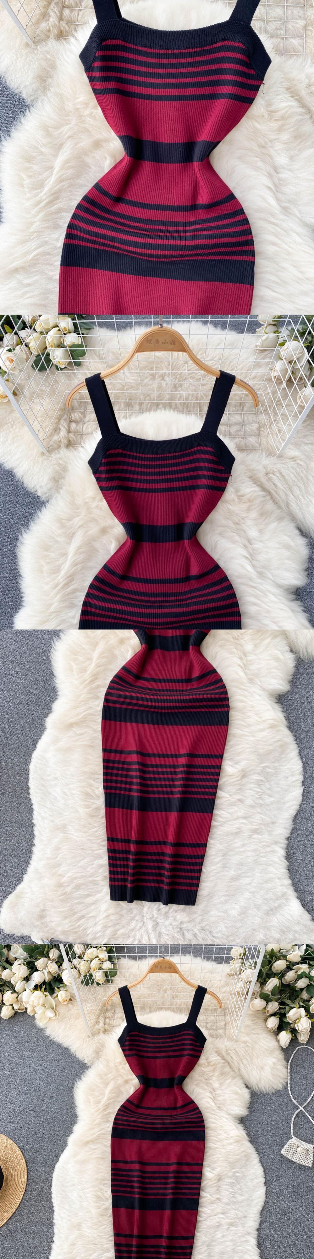 韓国版シックなノースリーブベストニットワンピースレディースサマー伸縮性タイトフィット薄手のストライプヒップボトミングスカート エラスティック 夏物 lyxaj19026334362