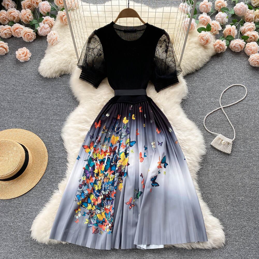 甘いメッシュのパフスリーブスリムミドル丈ニットステッチヘビーデューティープリーツプリントドレススカートドレス女性 大人ガーリー スウィート キュート カジュアル lyxaj88881746113