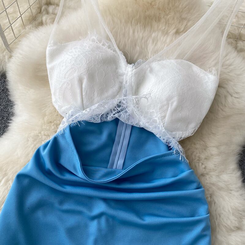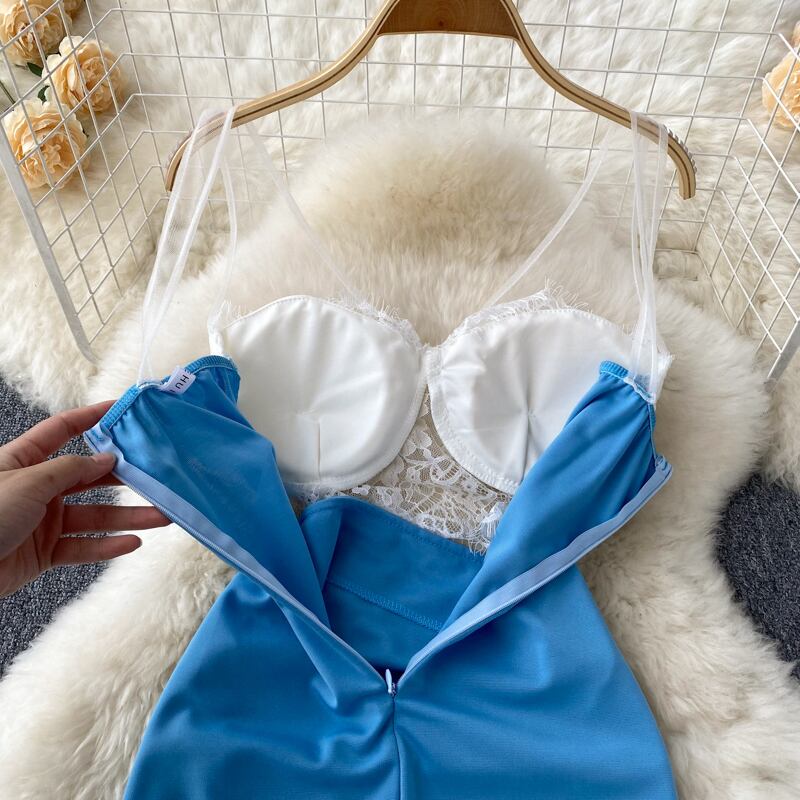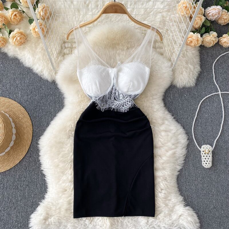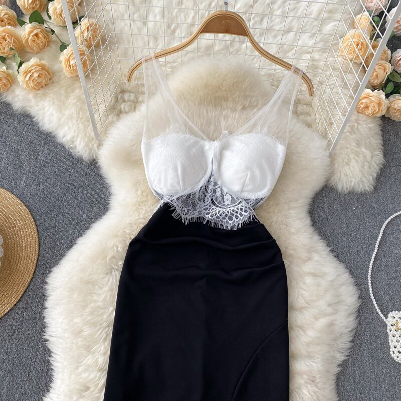 ナイトショー女性の純粋な欲望セクシーなサスペンダードレス女性の夏のニッチなデザインセンスステッチレースタイトフィットヒップスカート サマー 夏物 ピュア lyxaj496987717