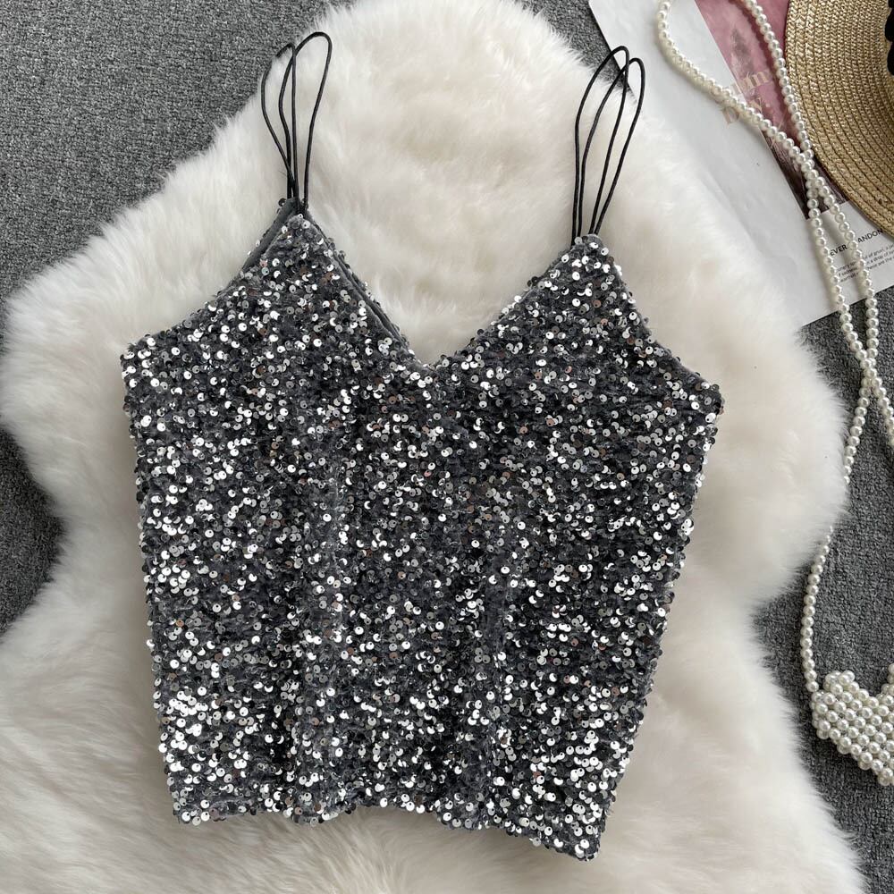 シックで見事なサスペンダートップの女性の2022年夏の新しいファッションVネックスパンコールショート気質ベスト サマー 夏物 lyxaj32208261441