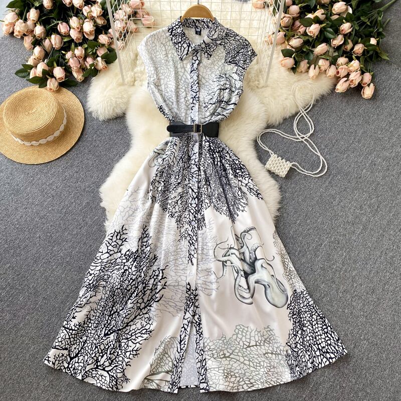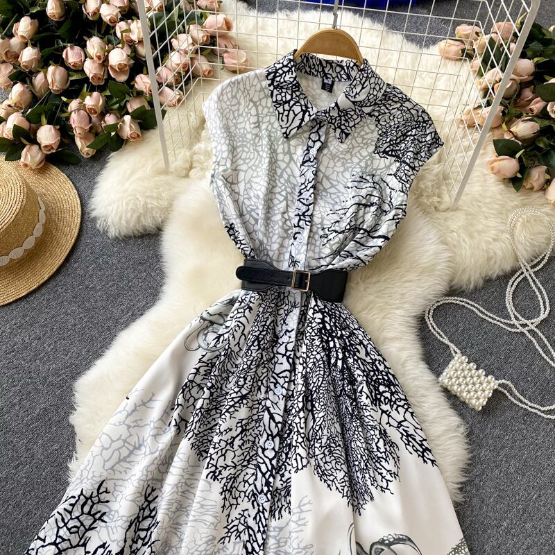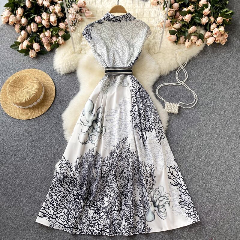 エスニックスタイルの水墨画2022フレンチニッチラペルノースリーブプリントドレスプリーツスカート膝上ロングスカートトレンド lyxaj65687197627