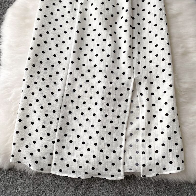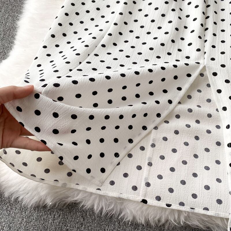 フランスの優しいスクエアネック水玉シフォンドレス女性の夏のエレガントな気質ハイウエスト細いスリットミドル丈スカート ハイウェスト サマー 夏物 スクウェア lyxaj75905618089
