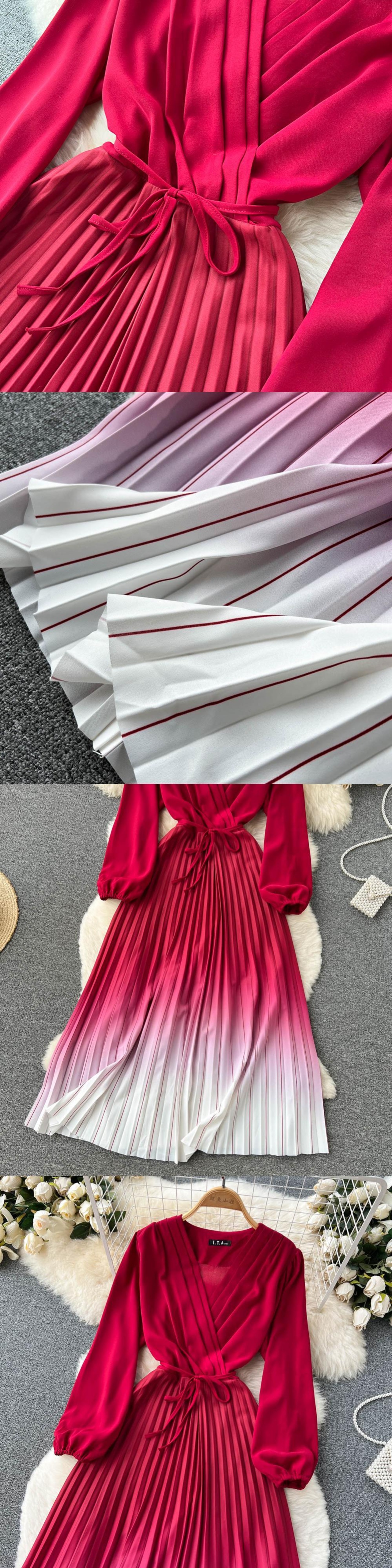 2022年春の新しいディープVネック長袖プレスウエストネクタイグラデーションプリーツドレス膝上フレンチドレス ロング スプリング 春物 lyxaj88858020675