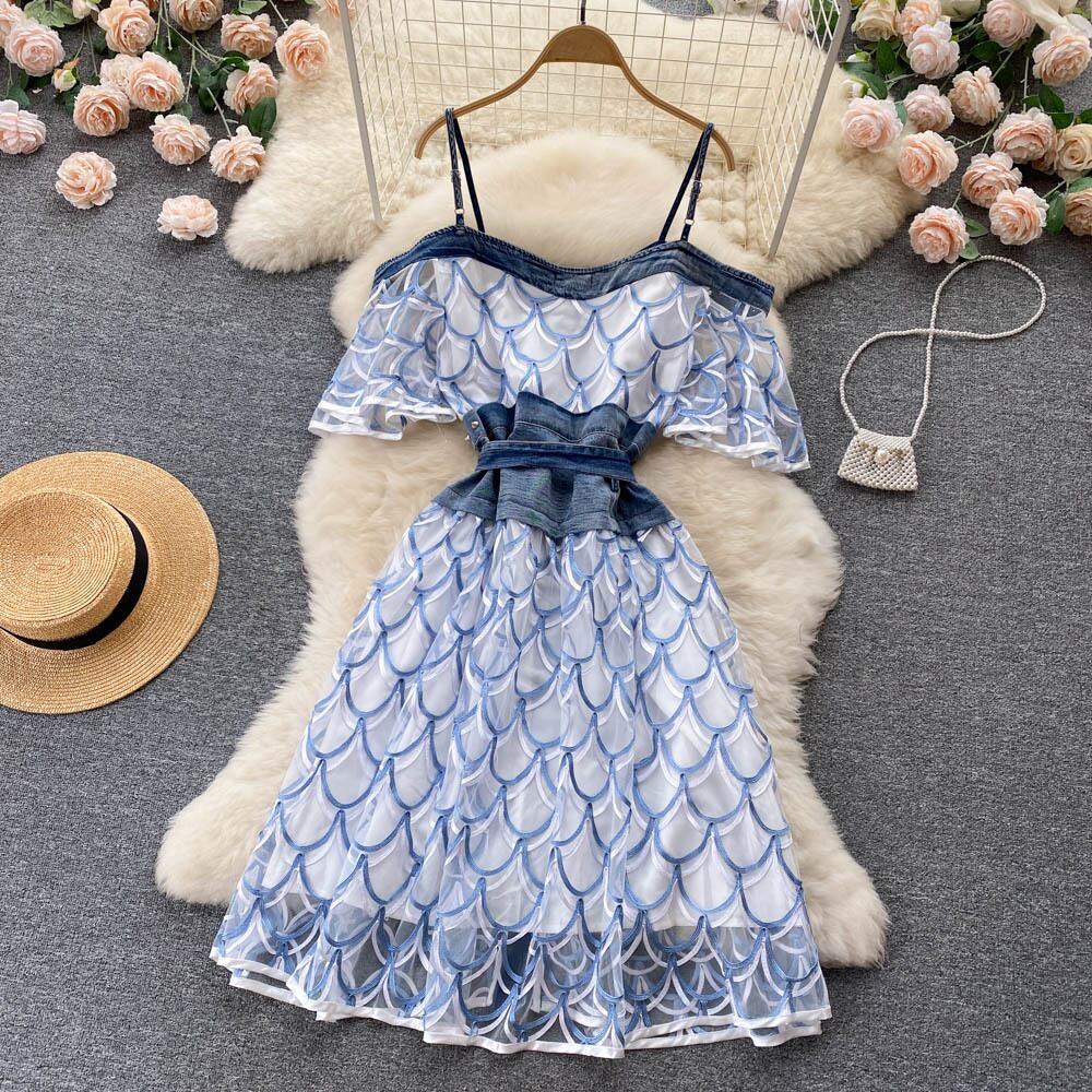 ヨーロッパとアメリカのレトロメッシュステッチデニムサスペンダードレス気質Vネックネクタイウエスト薄いヘビーデューティースカート ヨーロピアン lyxaj44552192595