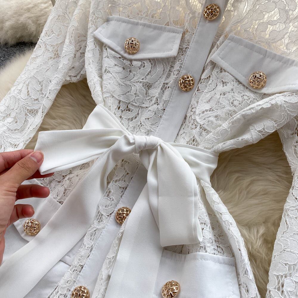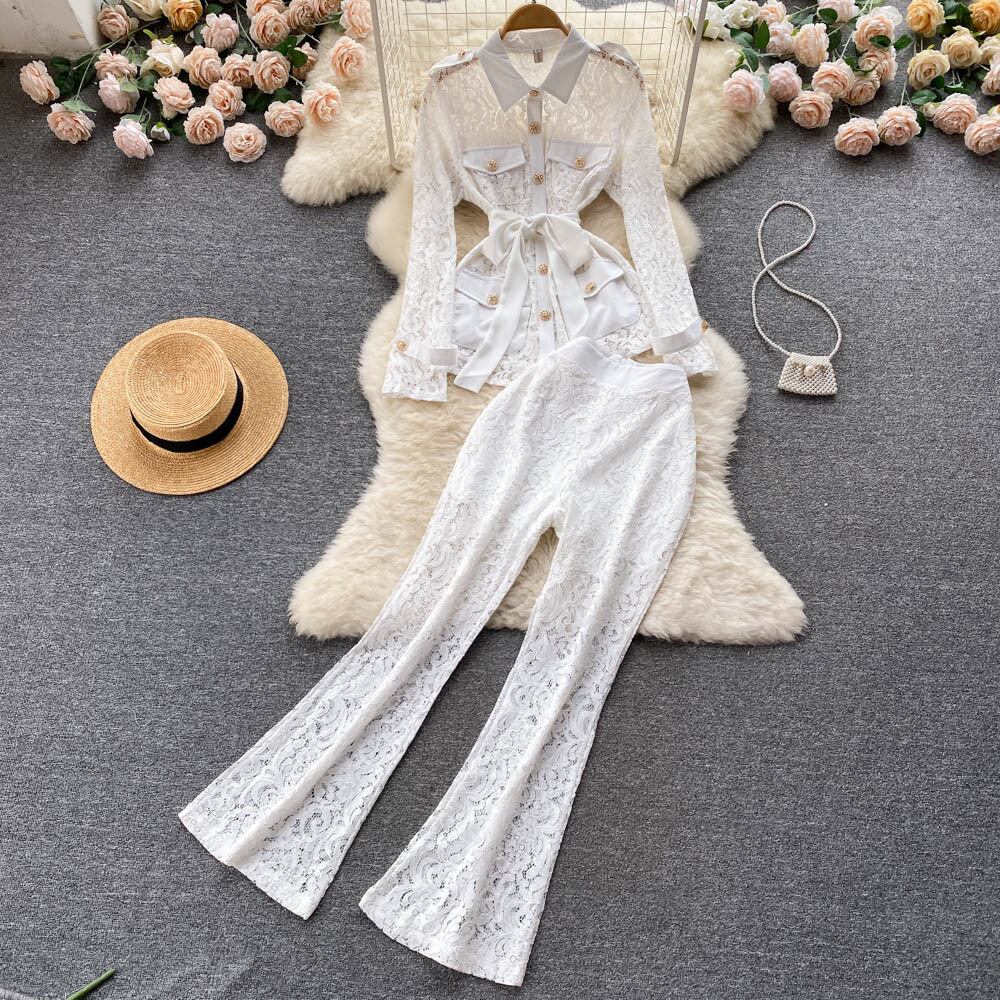 Chic high-end lace suit women's lace-up waist long-sleeved shirt high-waisted slim flared pants temperament two-piece suit ロング レッド レース スリム レースアップ lyxaj25892193974