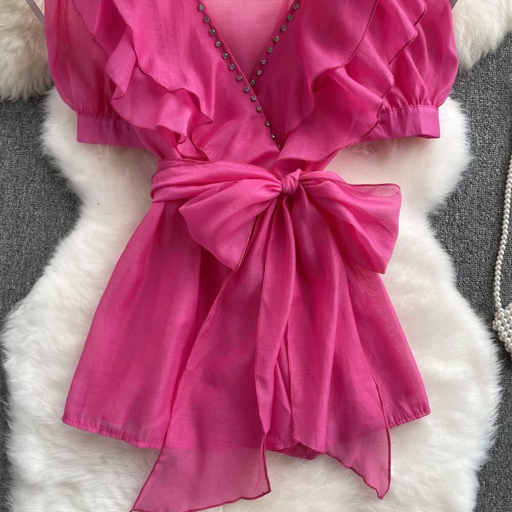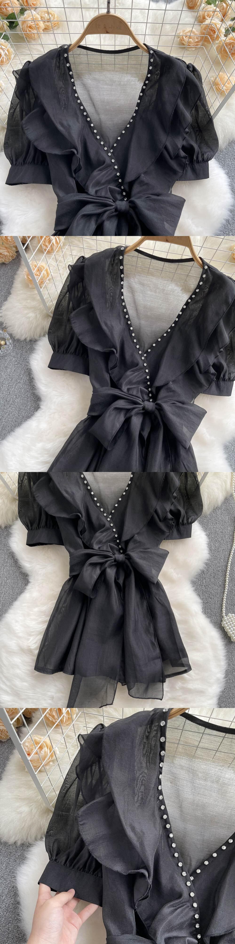 2022 summer new waist and slim design beaded V-neck tie bow French mesh chiffon top シフォン リボン サマー 夏物 メッシュ Vネック スリム lyxaj95838648237