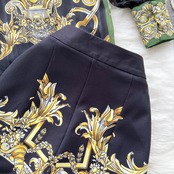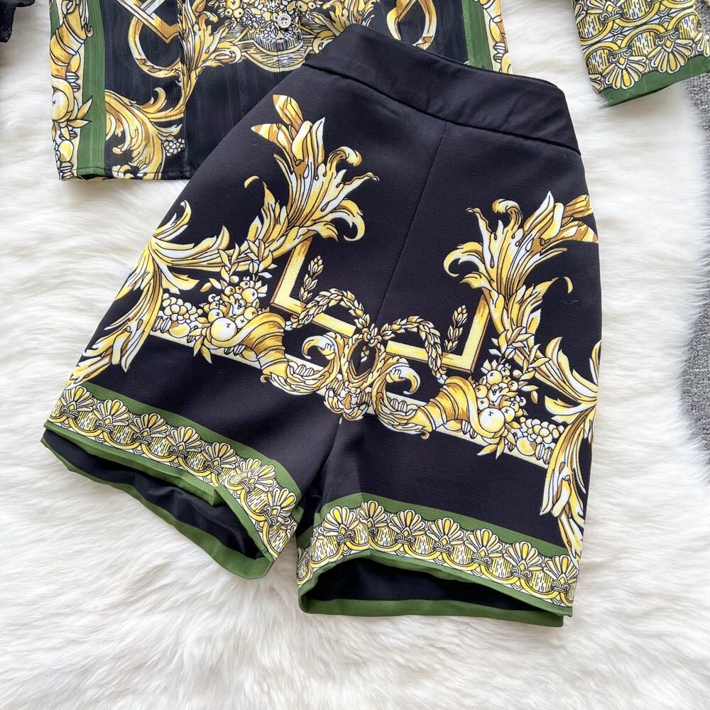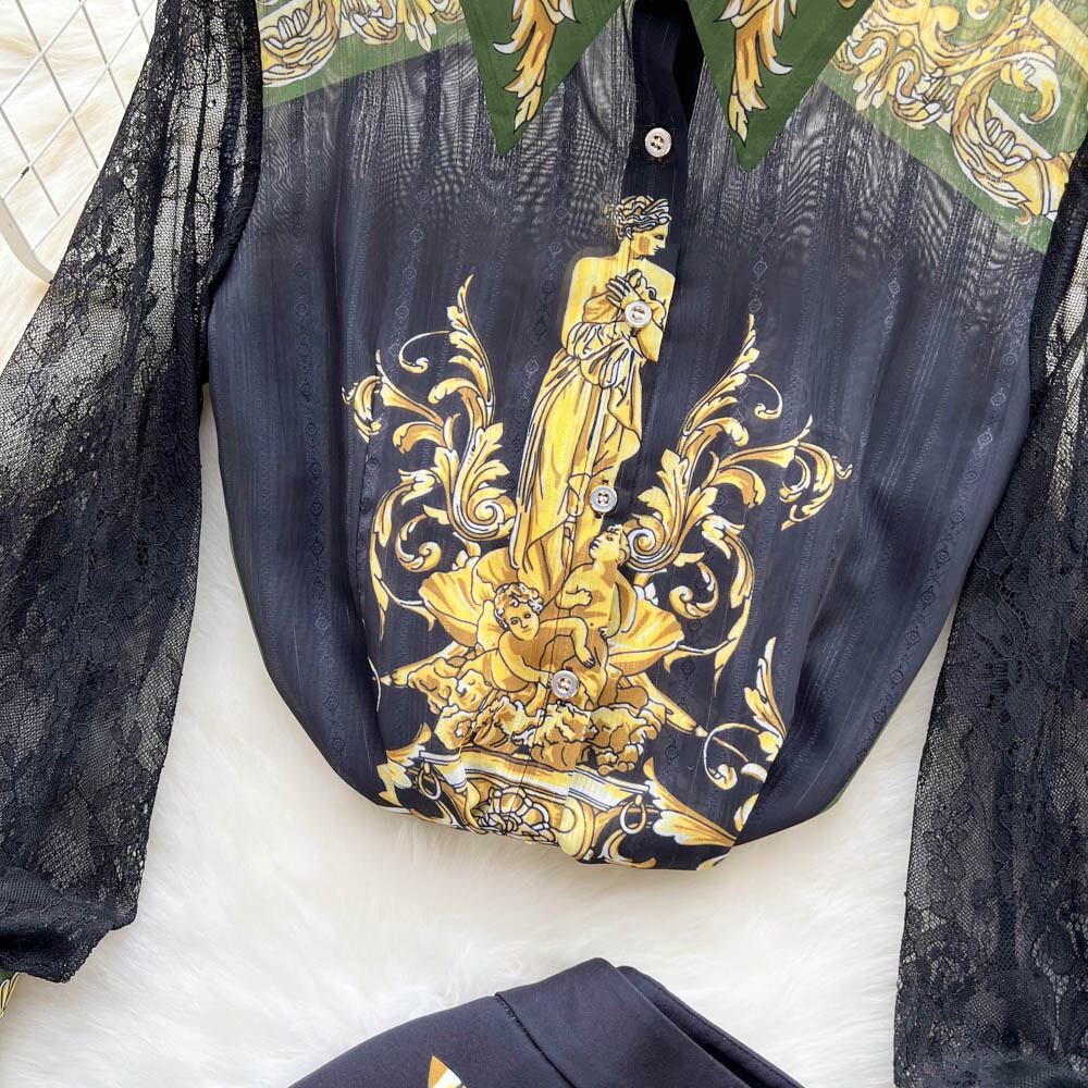 Retro palace style printed long-sleeved polo collar loose temperament shirt two-piece suit women's high-waisted wide-leg shorts ロング レトロ レース プリント ショーツ ブルマー lyxaj23218778388