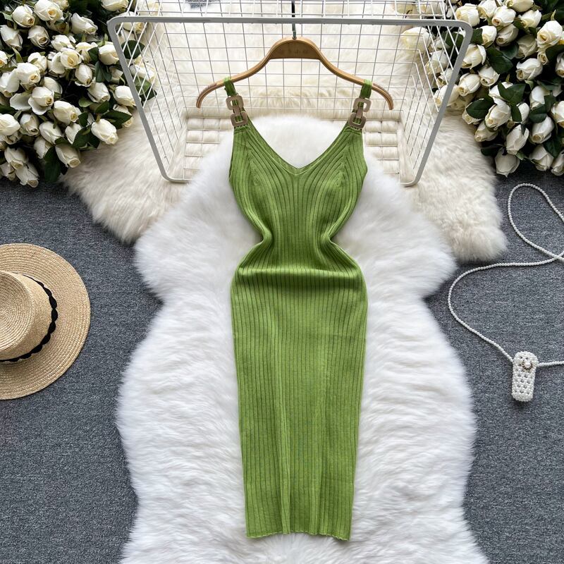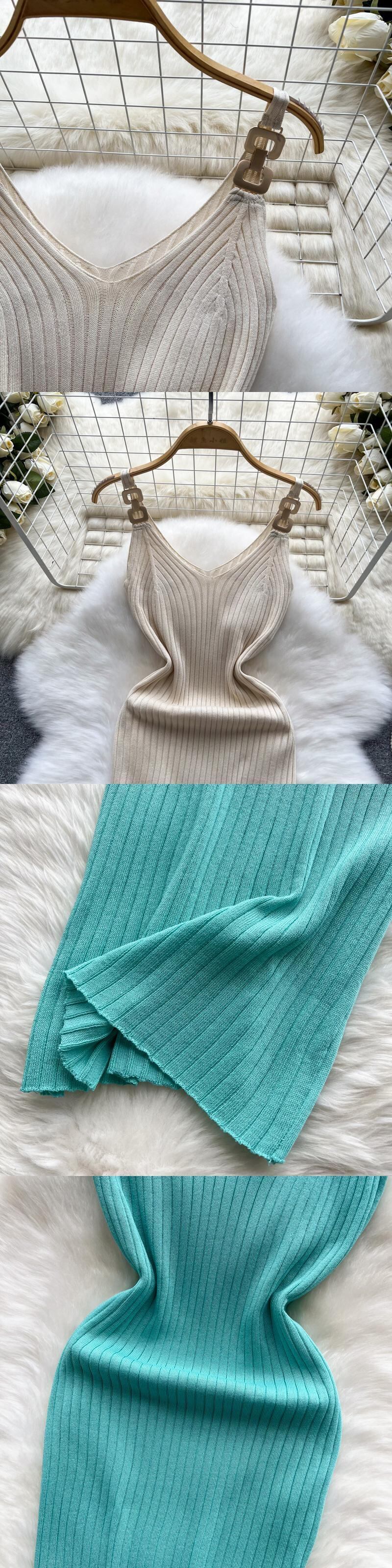 Gentle temperament V-neck suspender dress women's summer new elastic tight-fitting thin mid-length hip knitted skirt エラスティック 伸縮 サマー 夏物 スカート Vネック lyxaj65152509025