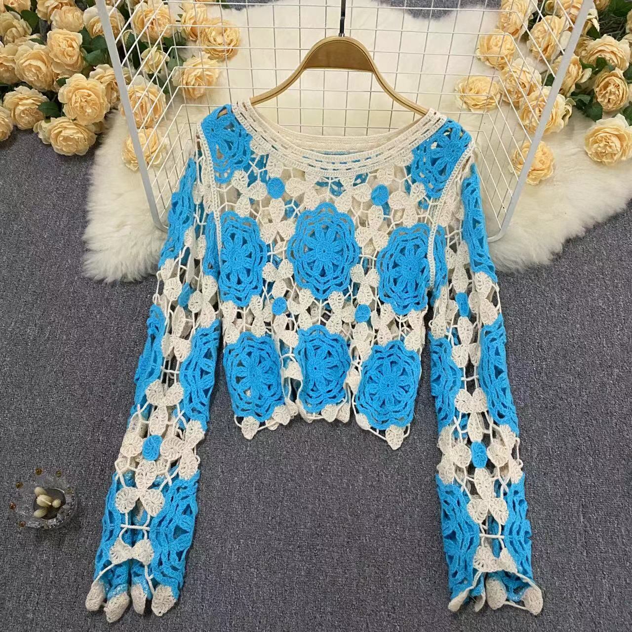 French loose crochet hollow long-sleeved knitted sweater women's summer thin section hundred matching skirt temperament round neck T-shirt top ロング レッド サマー 夏物 スカート Oネック Tシャツ lyxaj90101572630