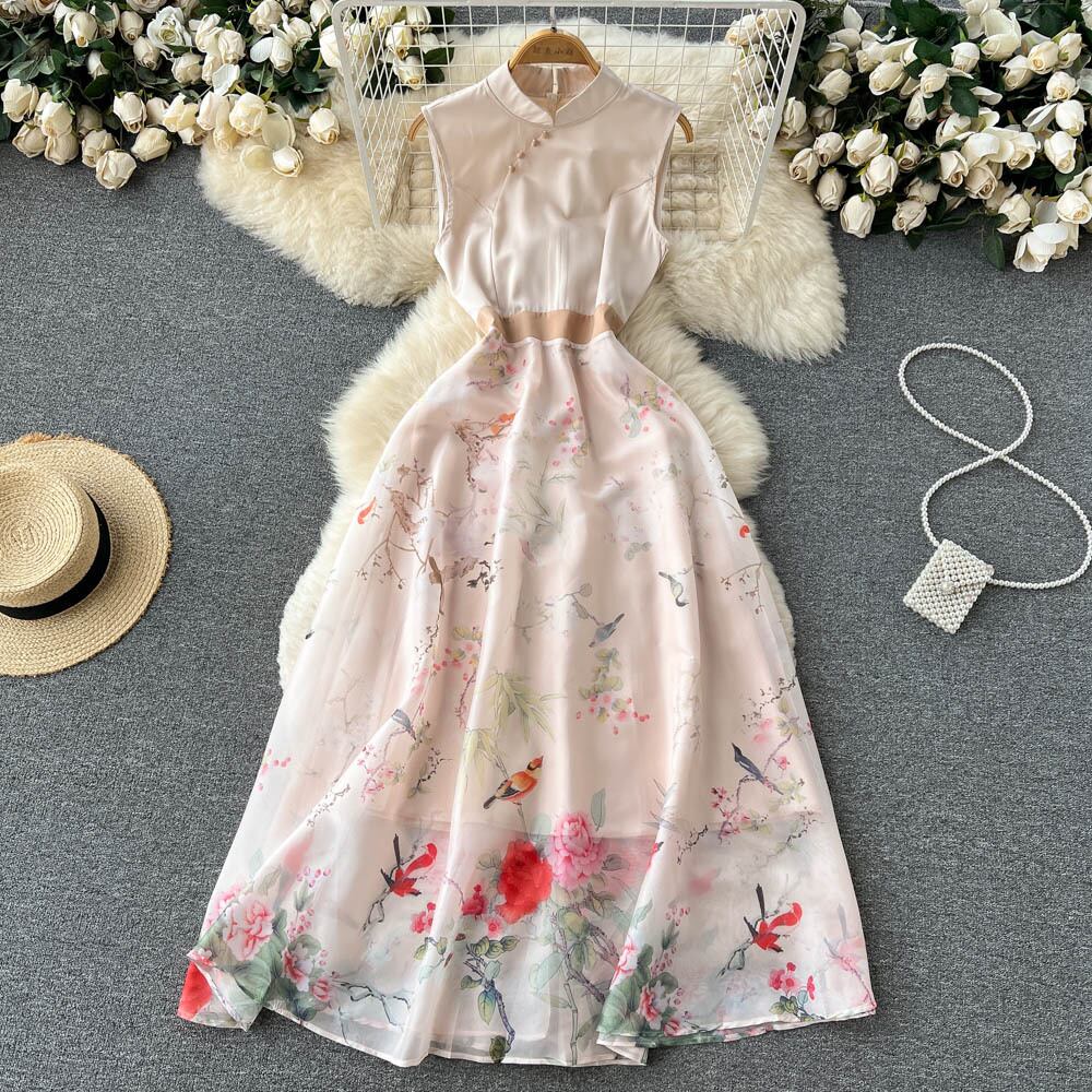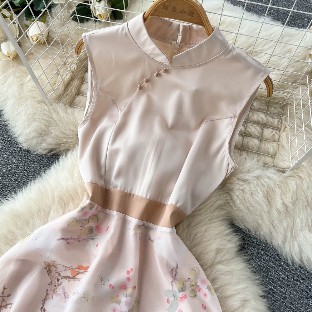 Ink painting cheongsam women's Chinese style print sleeveless dress 2022 summer new style stand collar waist waist long skirt ロング サマー 夏物 ノースリーブ スカート lyxaj134573808