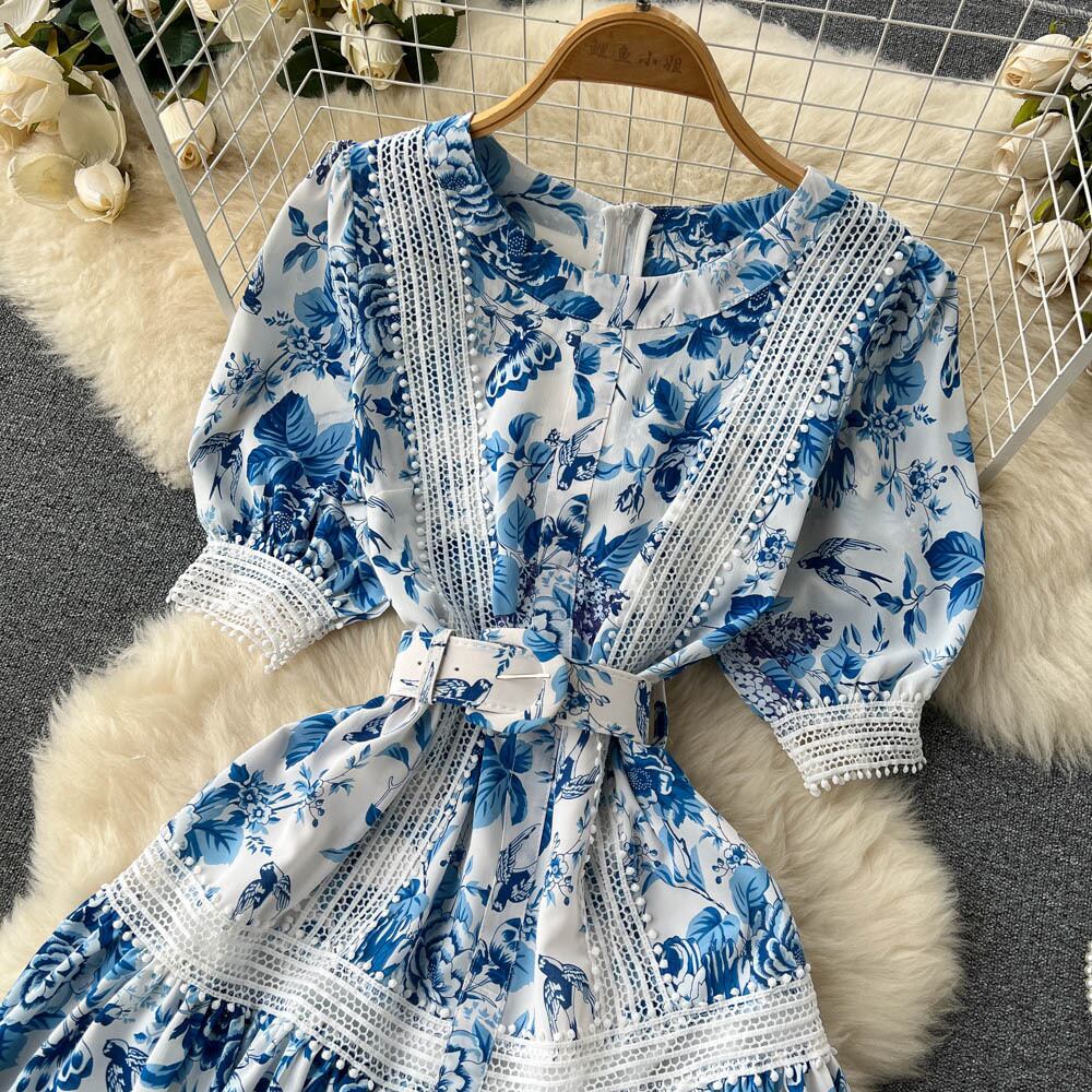 French blue print dress women's summer new lace lace mesh hollow a-line princess first love skirt ブルー レース サマー 夏物 メッシュ スカート Aライン lyxaj83760520602