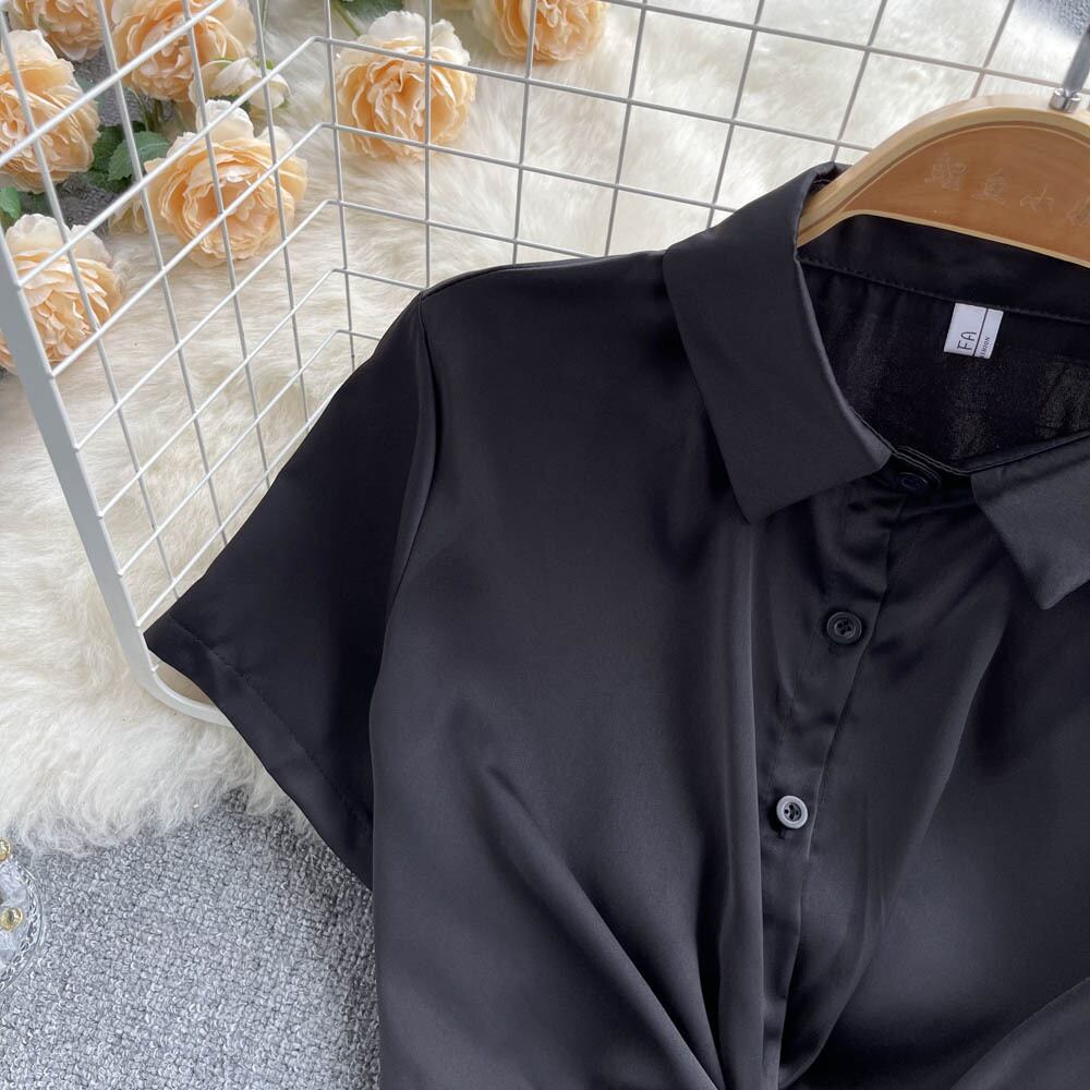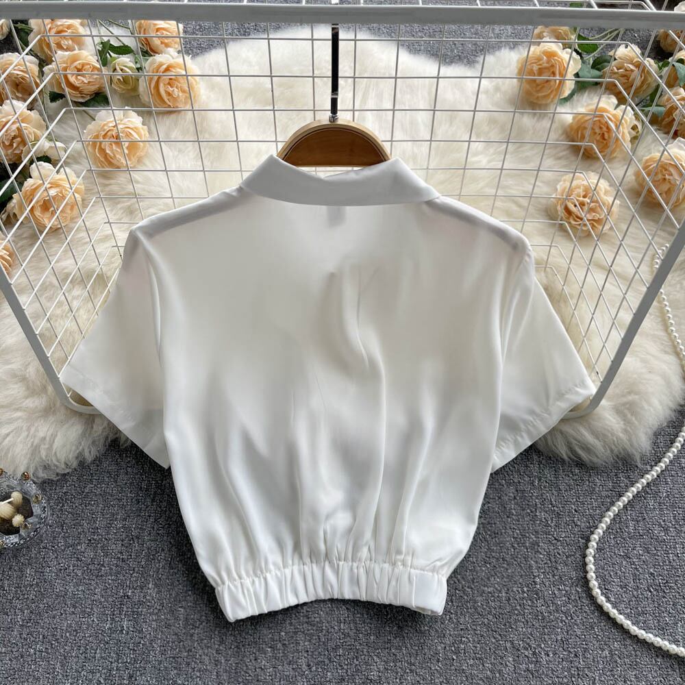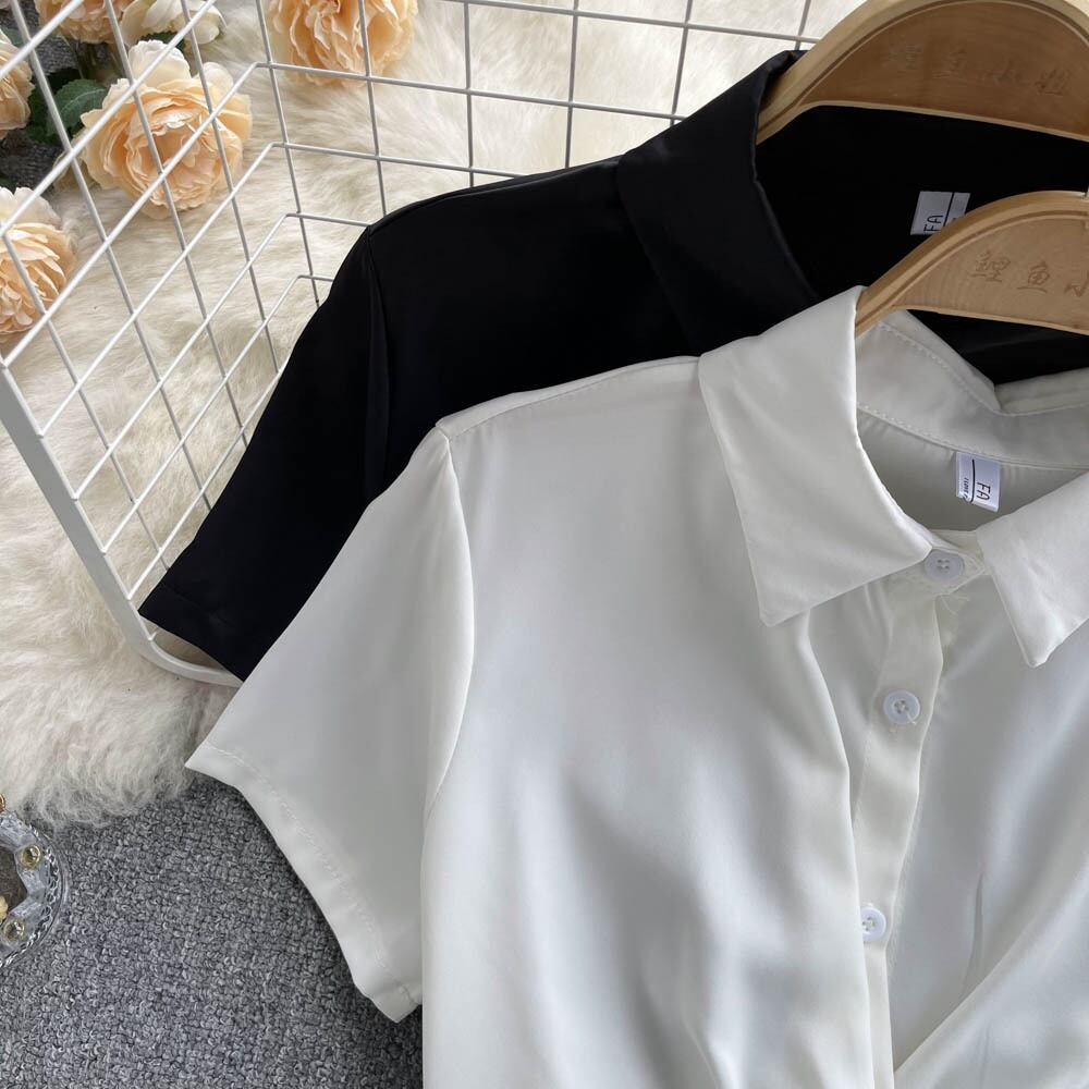 2022 summer new solid color lapel single-breasted short-sleeved shirt women's design sense niche kink short top trend ショート サマー 夏物 ソリッドカラー lyxaj60456116610