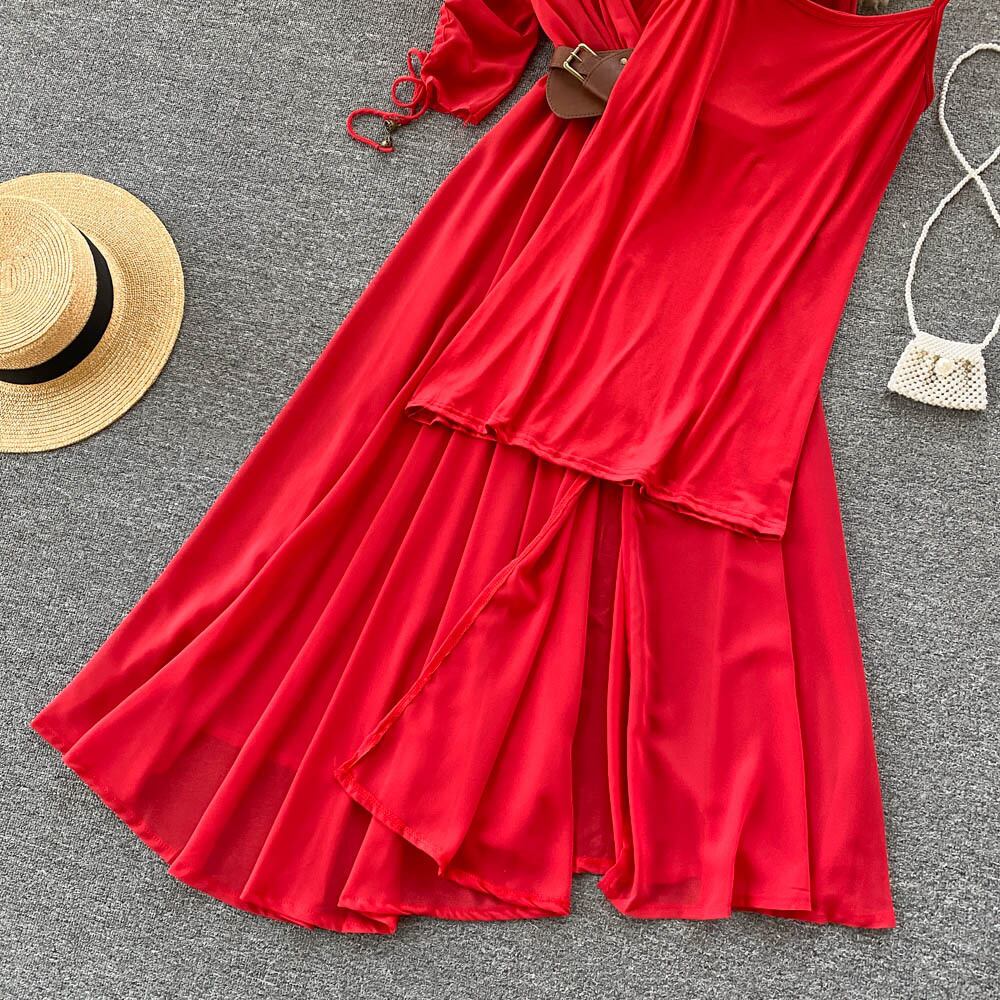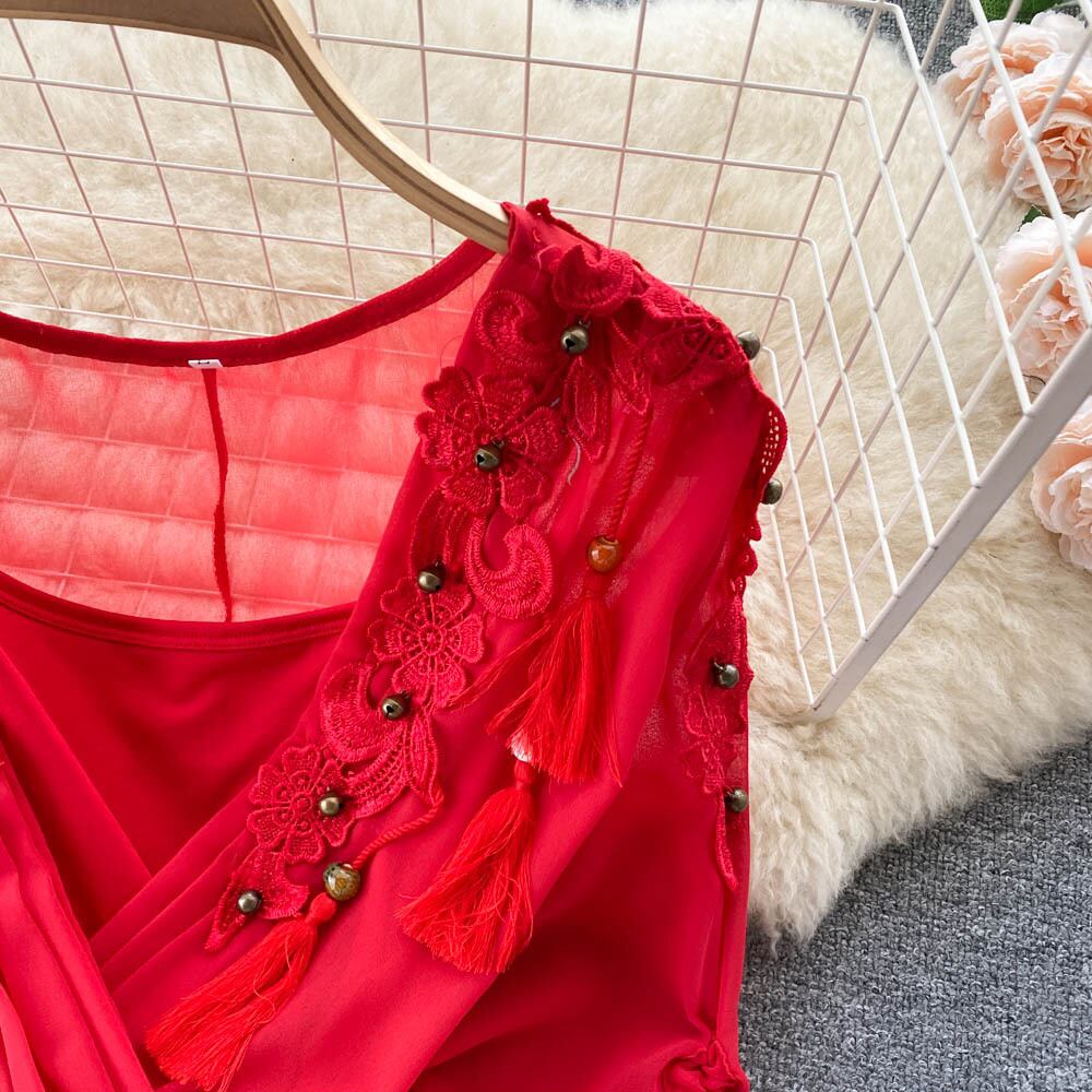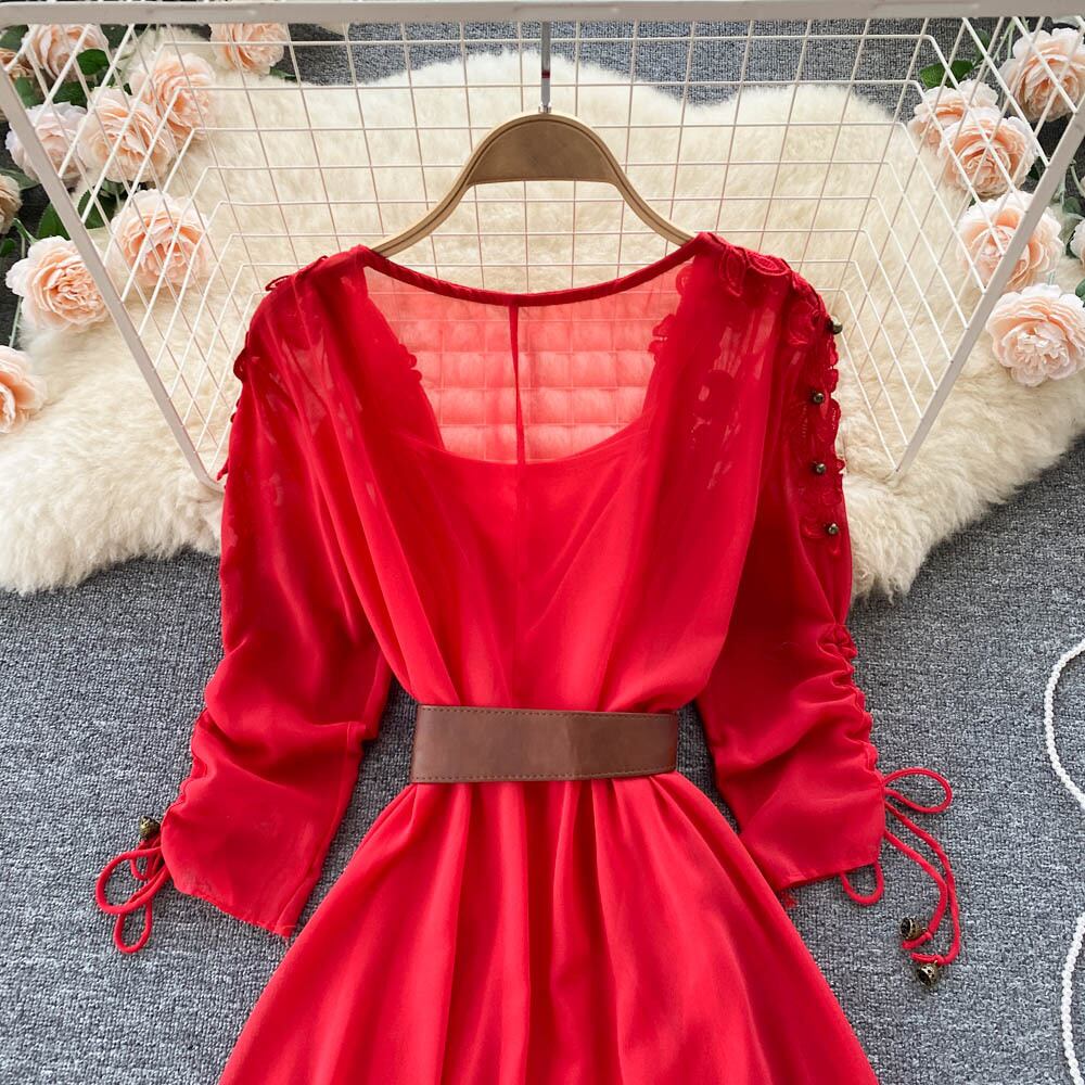 2022 spring new retro ethnic style holiday skirt niche design drawstring three-quarter sleeve chiffon dress women シフォン レトロ スプリング 春物 スカート lyxaj6300964634