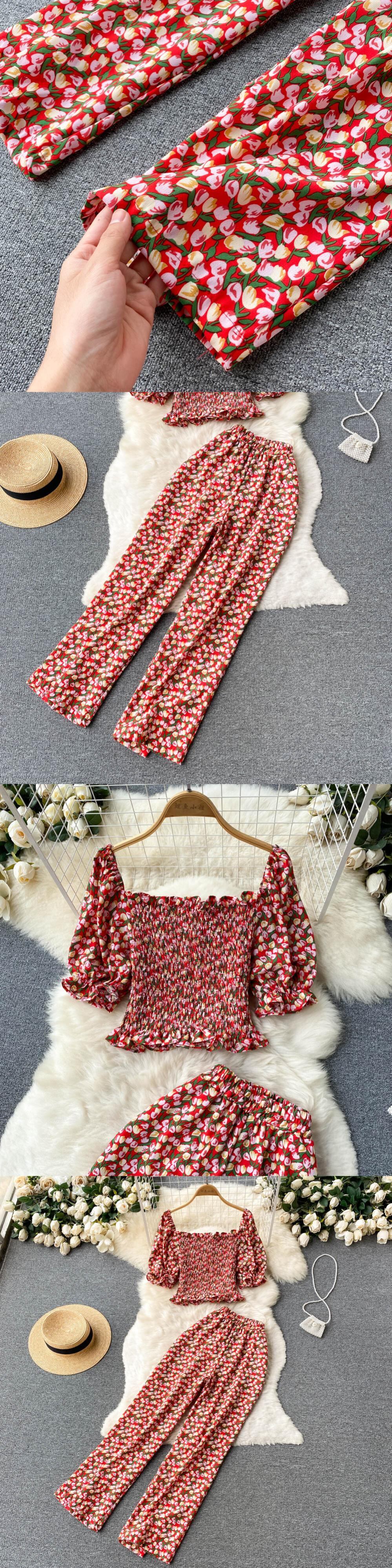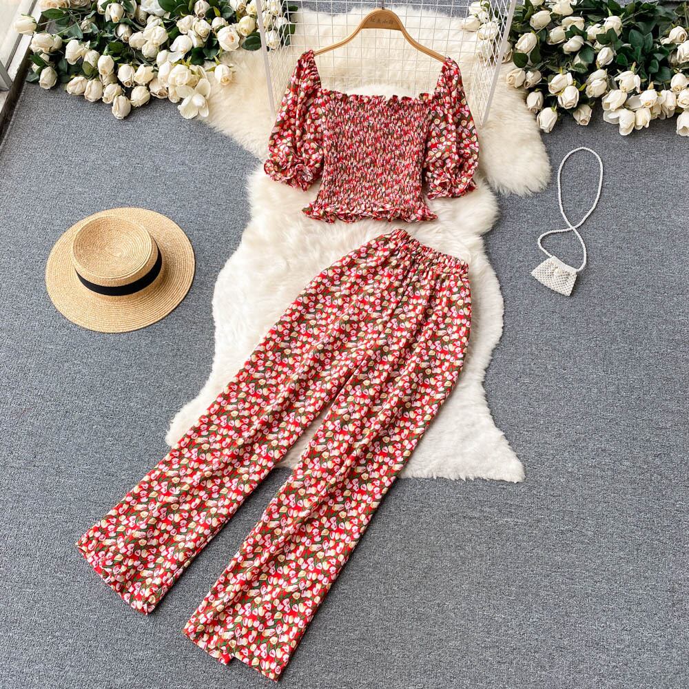 French romantic floral suit female summer version small fresh slim short top casual long pants two-piece set ショート ロング カジュアル サマー 夏物 花柄 スリム lyxaj95390964964