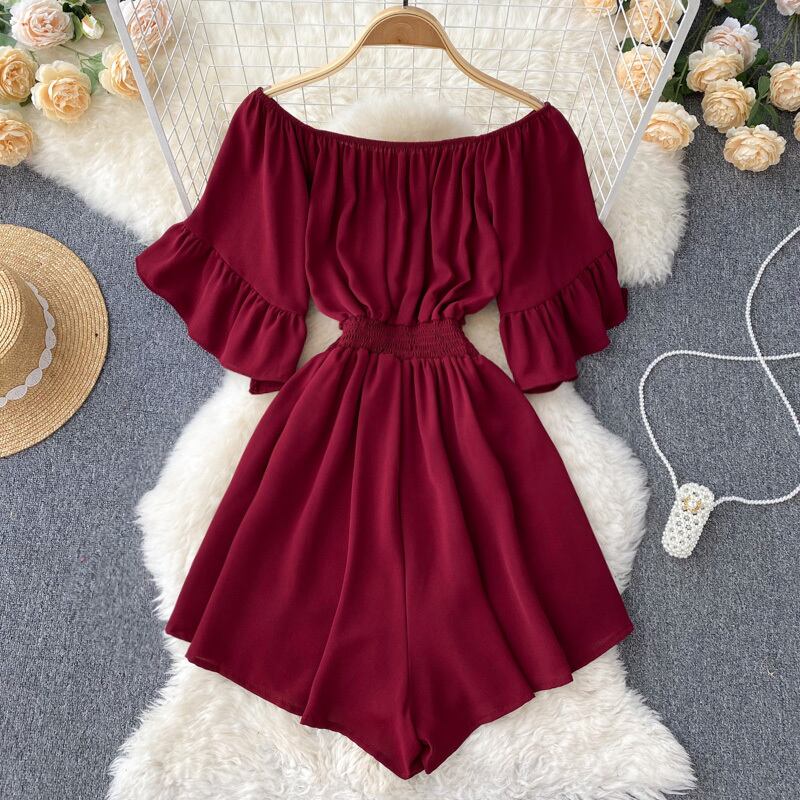 Summer super fairy temperament jumpsuit women's holiday style high-waisted short wide-leg pants one-shoulder bell-sleeve jumpsuit ショート サマー 夏物 lyxaj67917595858