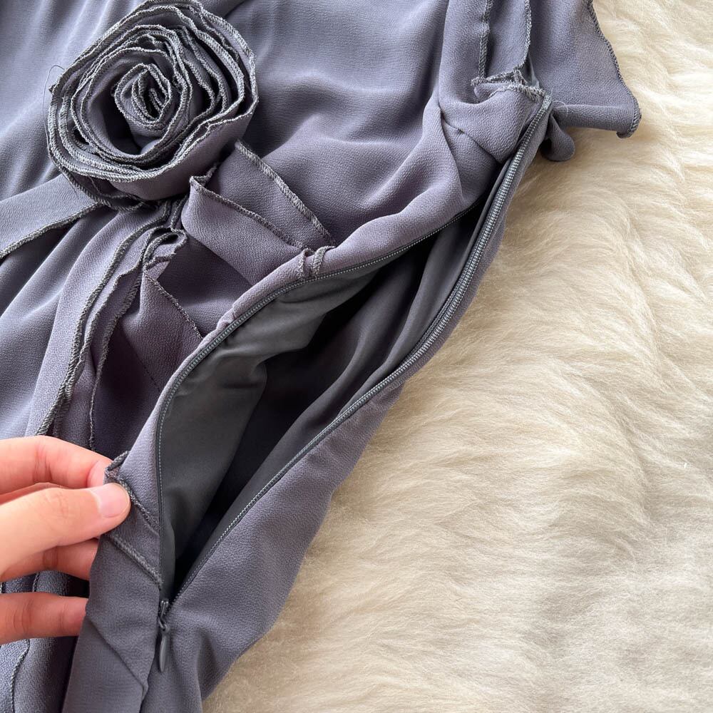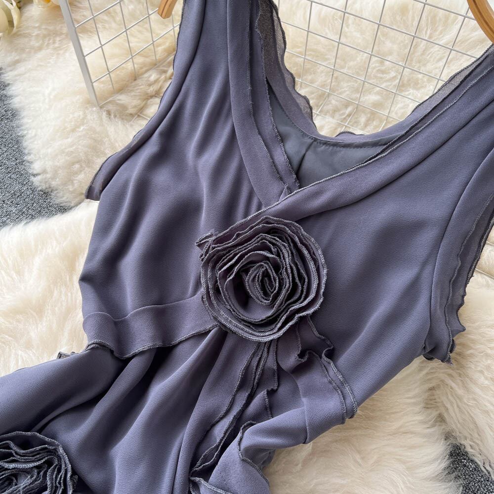 French retro stand-up collar flower V-neck design dress female summer waist slim temperament all-match A-line skirt レトロ サマー 夏物 スカート Vネック Aライン スリム フラワーデザイン lyxaj669945826