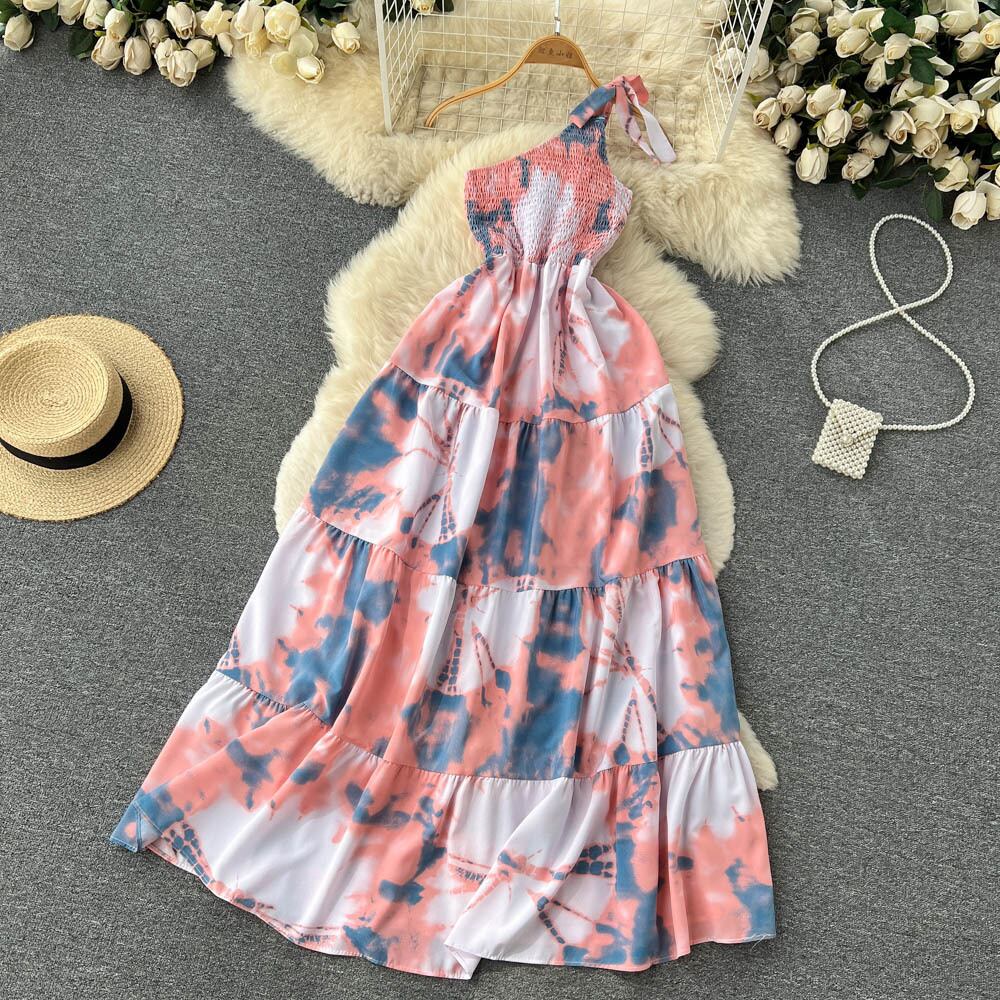 Summer retro tie-dye fashion print suspender skirt seaside holiday beach skirt high waist slim big swing dress female ハイウェスト レトロ サマー 夏物 ビーチ スカート スリム lyxaj27675540637