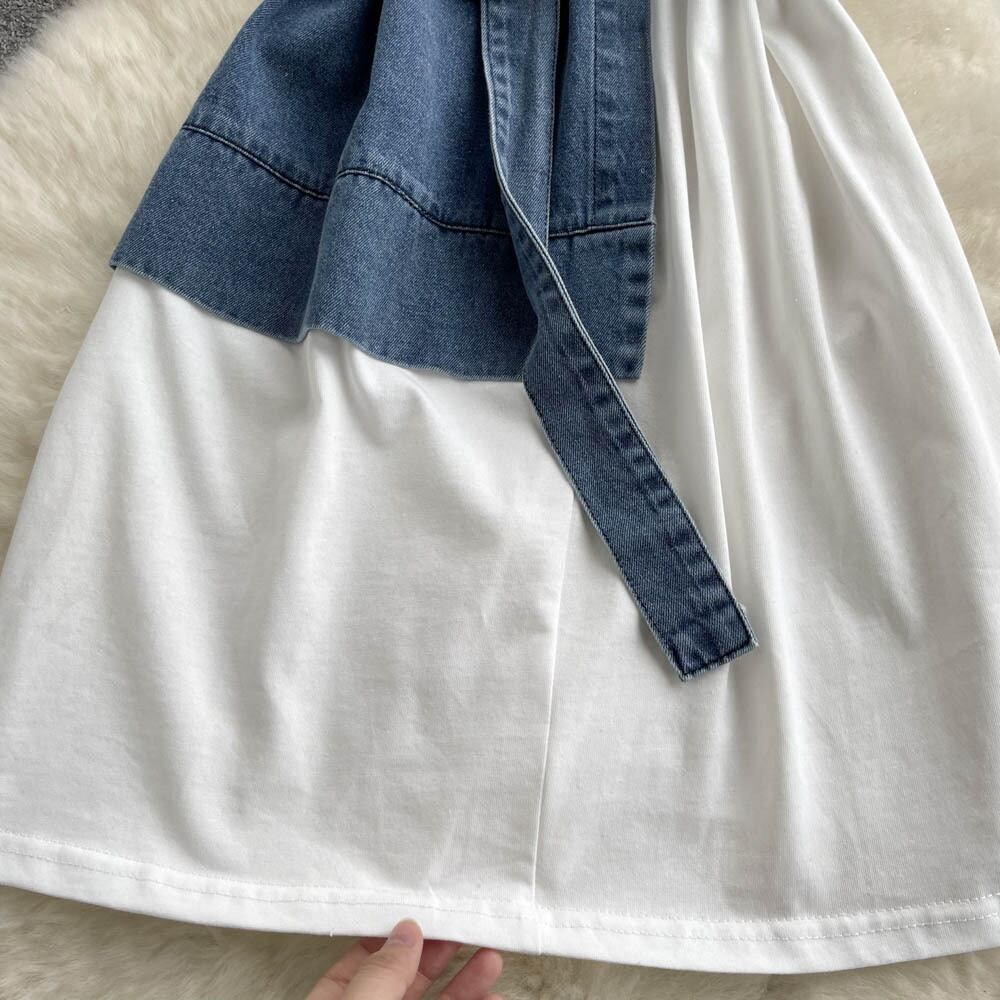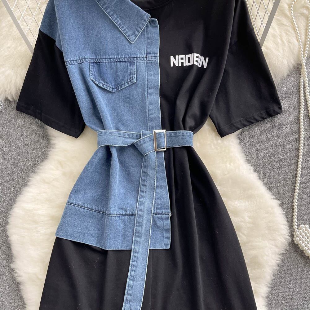 Chic design sense of denim stitching T-shirt dress women's summer new lace waist thin round neck A-line skirt レース サマー 夏物 スカート Oネック Aライン Tシャツ ステッチ lyxaj52055990667