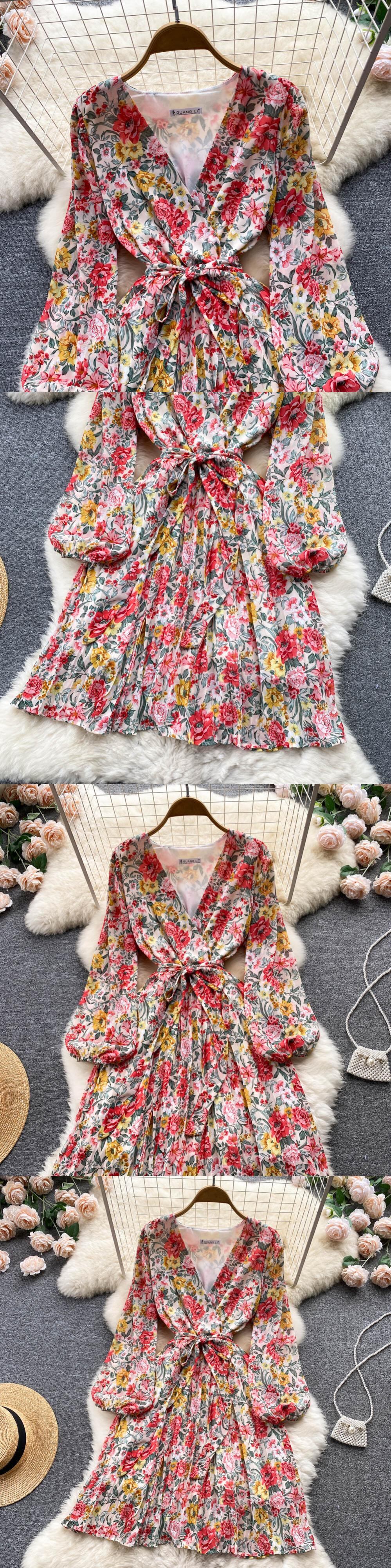 Yujie's light and cooked V-neck long-sleeved floral dress women's spring and autumn new lace-up waist fairy temperament A-line skirt ロング レース スプリング 春物 オータム 秋物 花柄 スカート Vネック Aライン レースアップ lyxaj62895648346