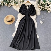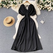 French puff sleeves waist slim dress summer women's high-end red backless chic stunning long skirt ロング レッド サマー 夏物 スカート スリム lyxaj38575520657