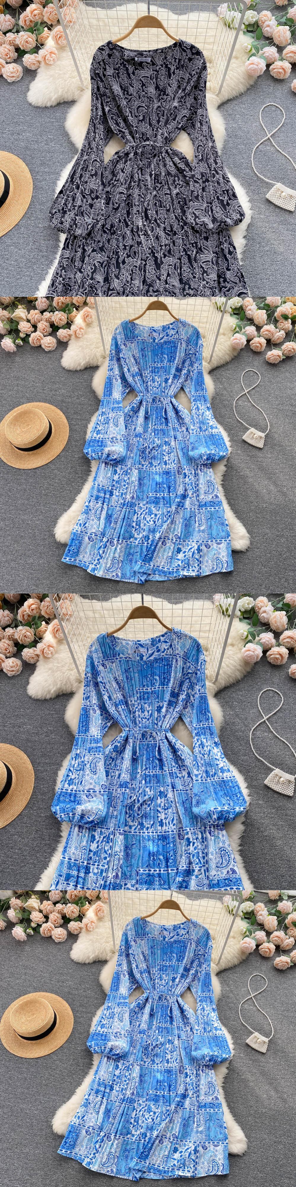 French retro long floral skirt 2022 autumn new women's high-end temperament long-sleeved chiffon dress ロング シフォン レトロ オータム 秋物 花柄 スカート lyxaj47884238808