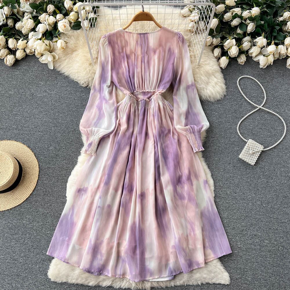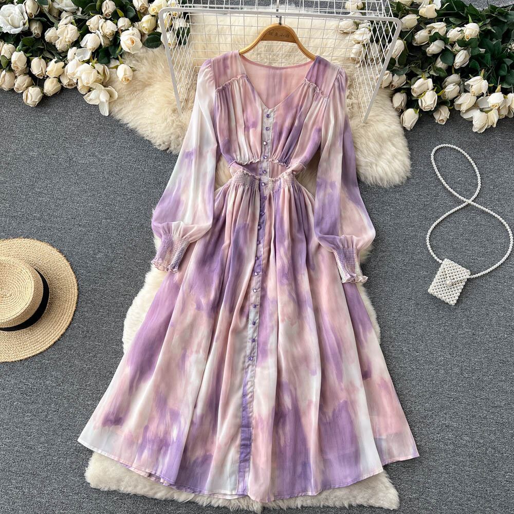 French retro tie-dye printed tea break dress women's spring and autumn 2022 new waist and slim V-neck long skirt ロング レトロ プリント スプリング 春物 オータム 秋物 スカート Vネック スリム lyxaj54483017498