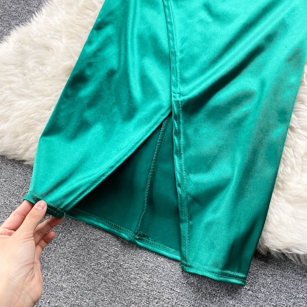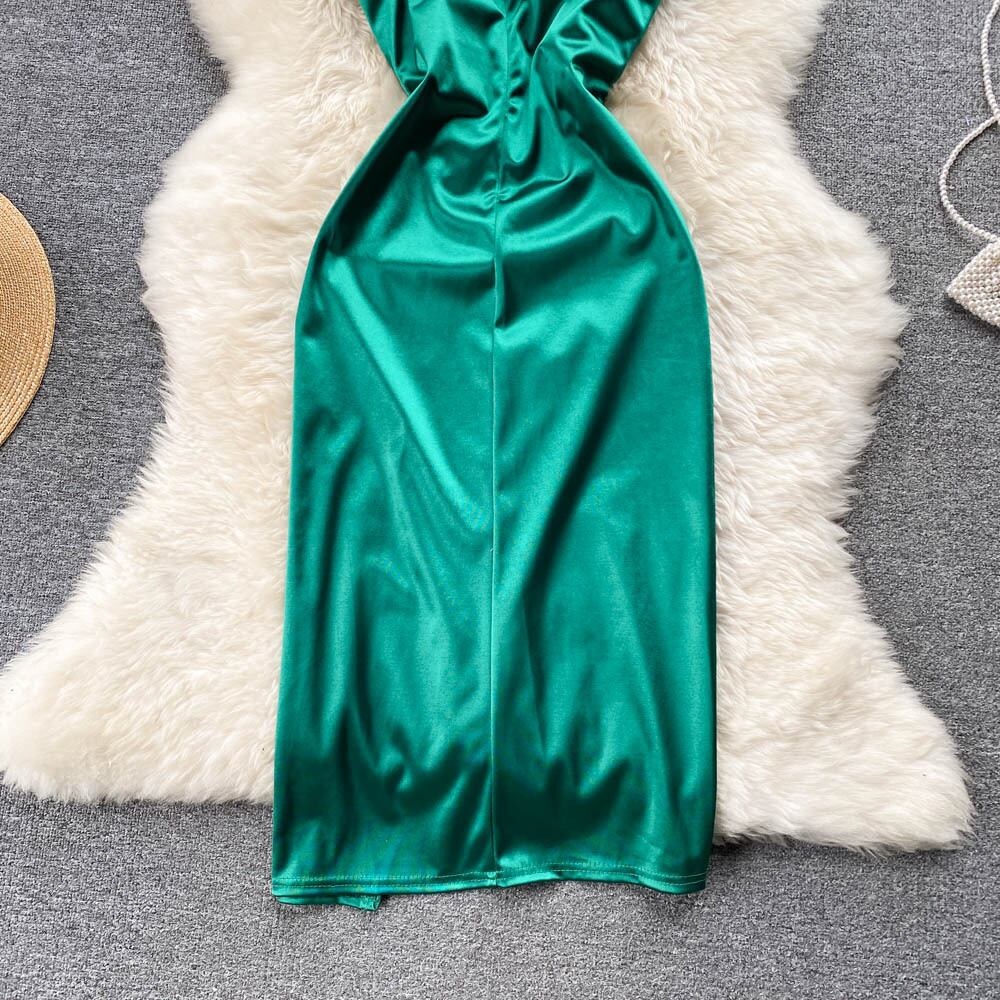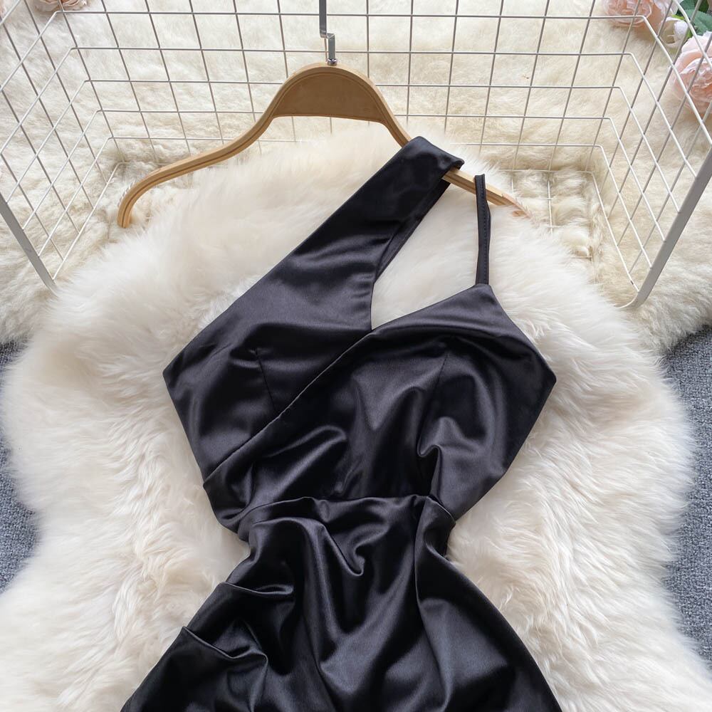Summer new satin temperament elegant and feminine ladies slim sloping shoulders irregular mid-length dresses エレガント サマー 夏物 ドレス サテン スリム lyxaj66104319773