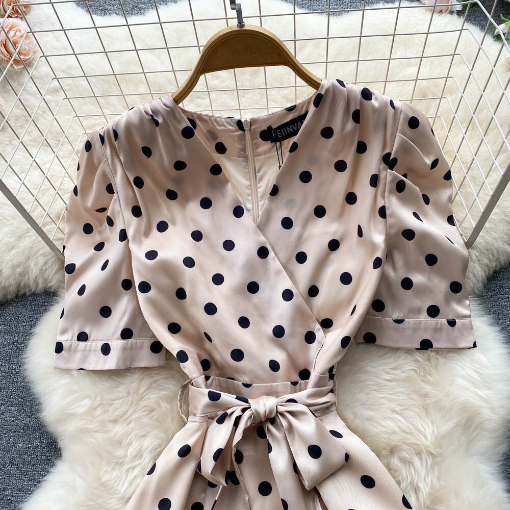 Polka dot dress female summer 2022 new bubble short-sleeved temperament goddess fan lace-up slim A-line long skirt ロング レース サマー 夏物 スカート Aライン スリム レースアップ lyxaj27942627555
