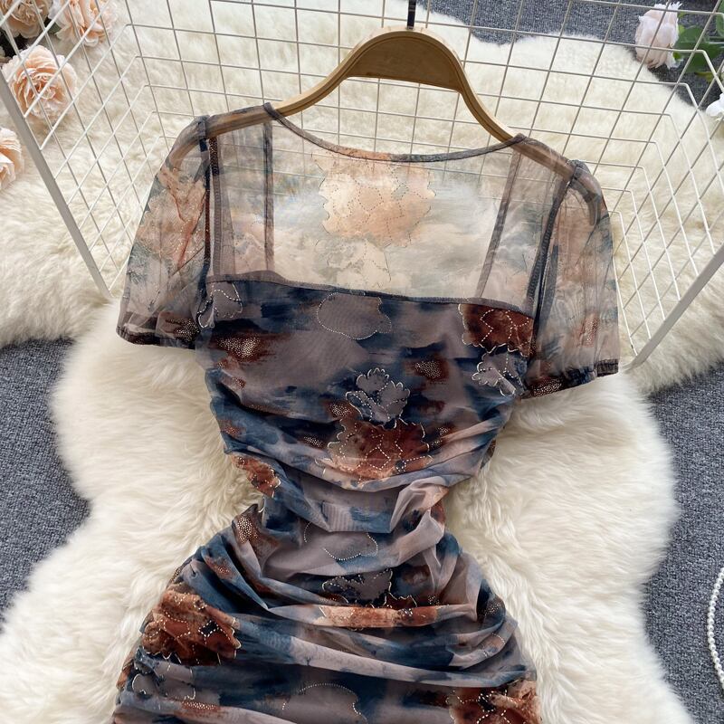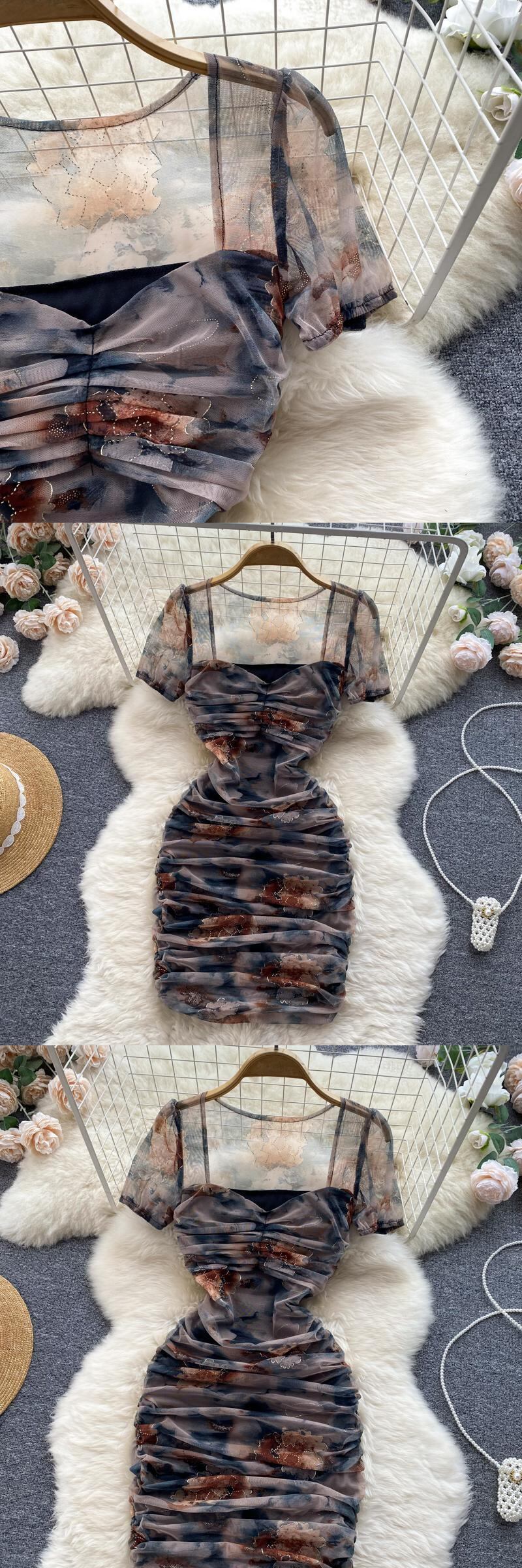 Summer new retro print embroidery flower pleated mesh slimming hip square neck sexy temperament dress trendy レトロ 刺繍 プリーツ サマー 夏物 メッシュ フラワーデザイン スクウェア lyxaj47686196354