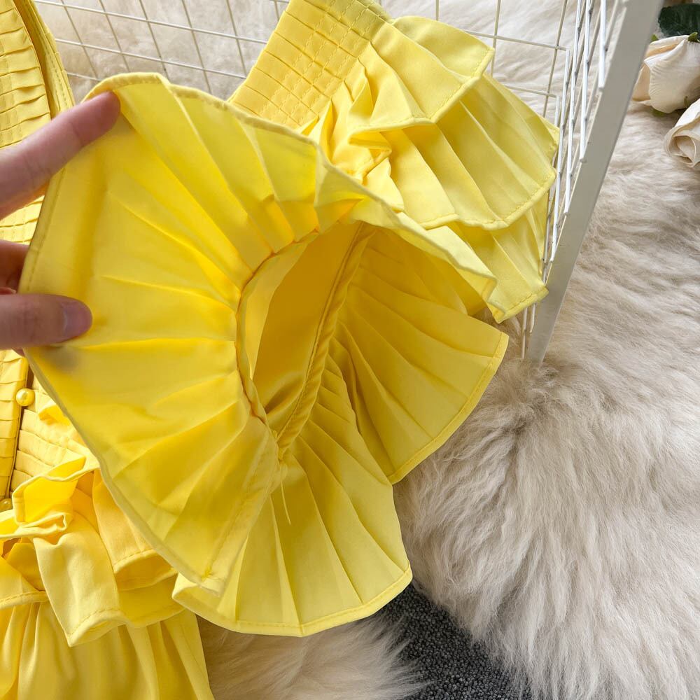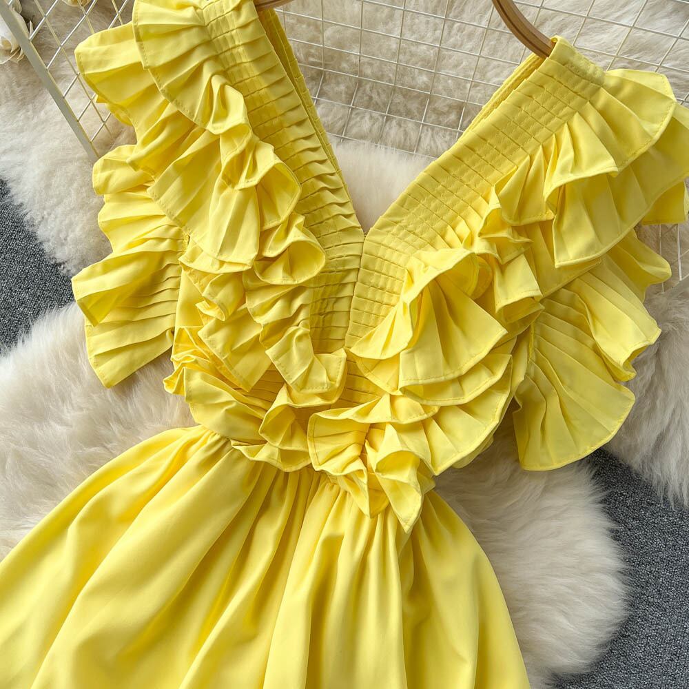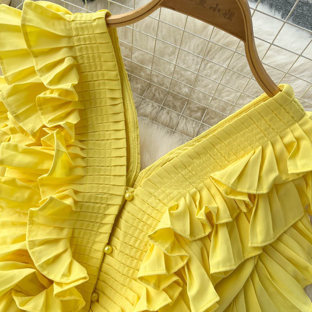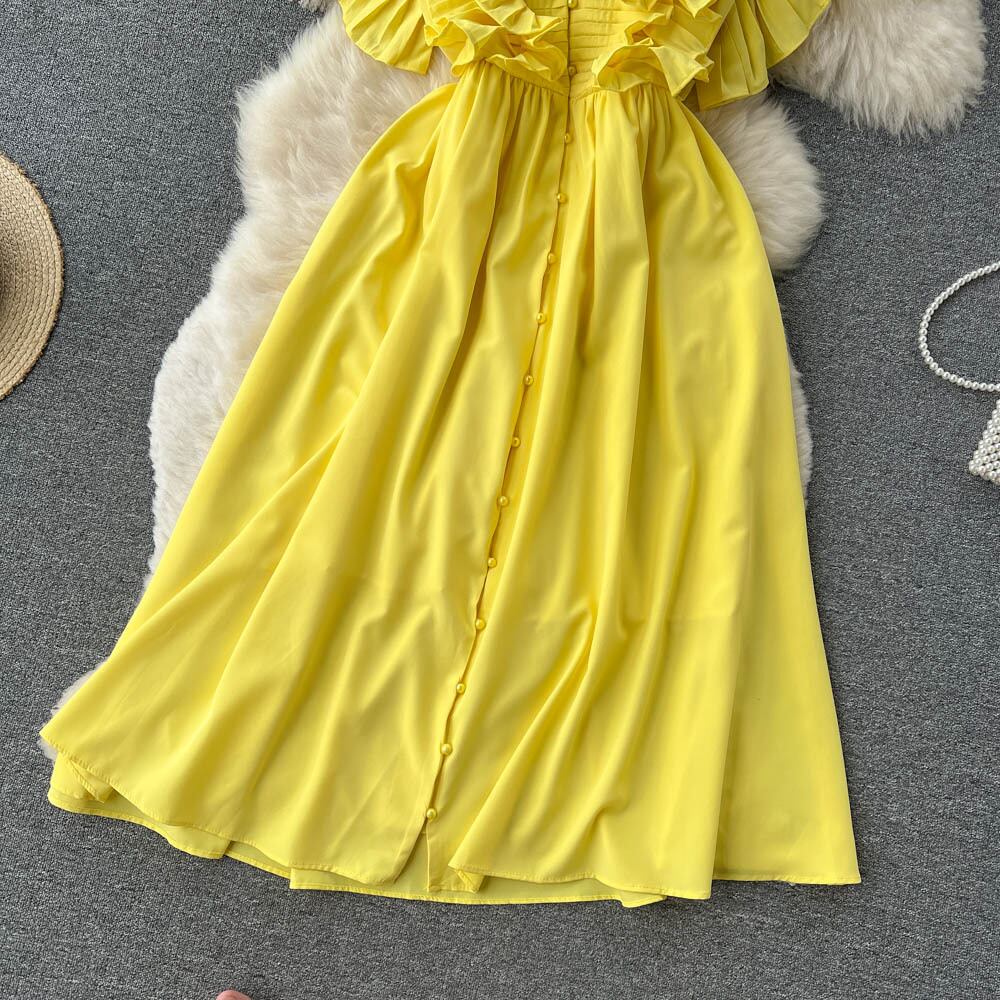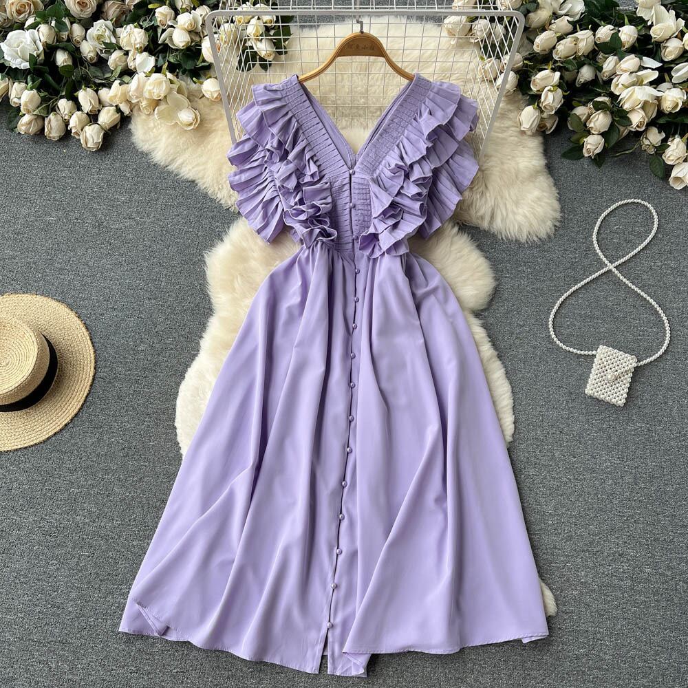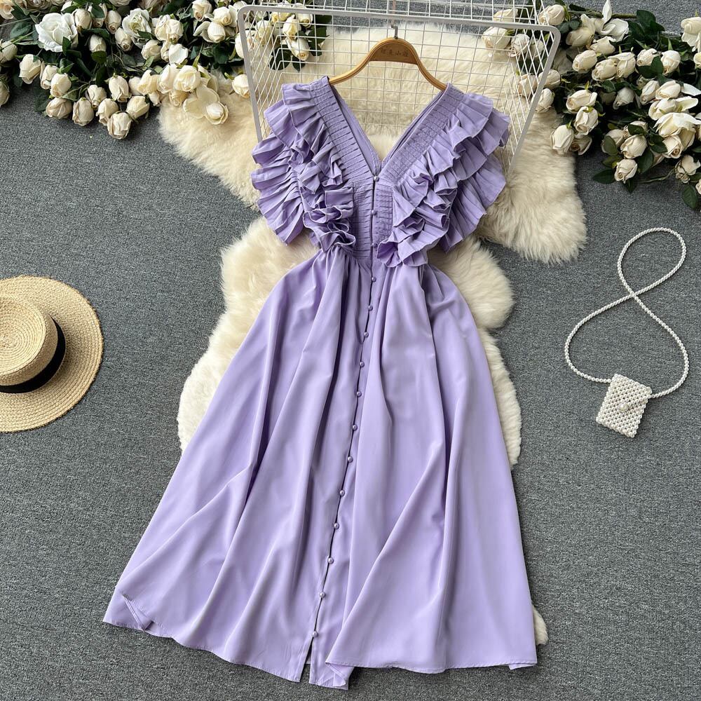 French gentle style V-neck lotus leaf design dress female waist slim lady fashion big swing A-line skirt スカート Vネック Aライン スリム lyxaj36082861540