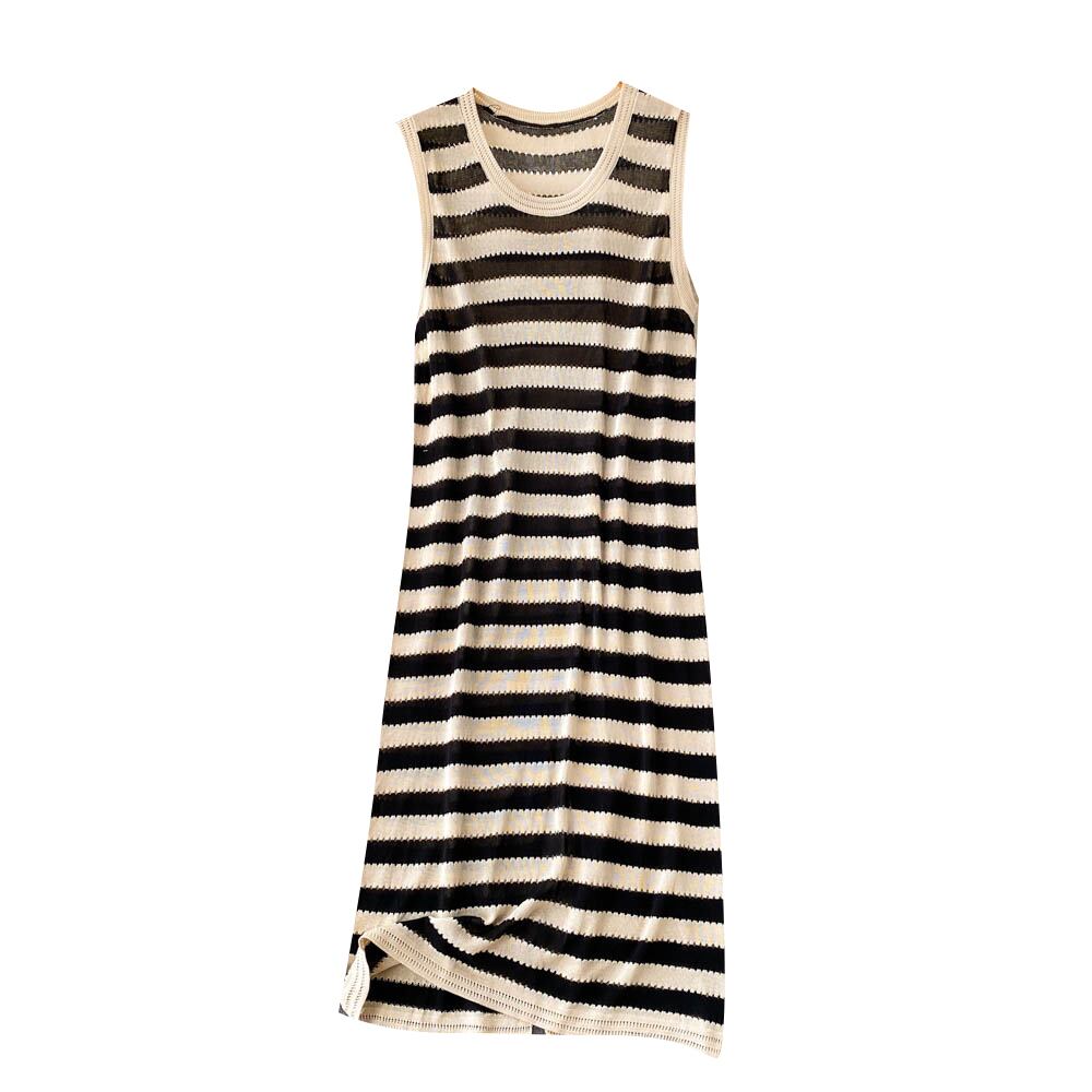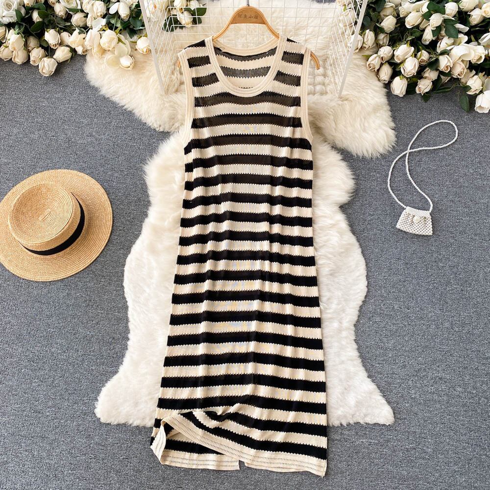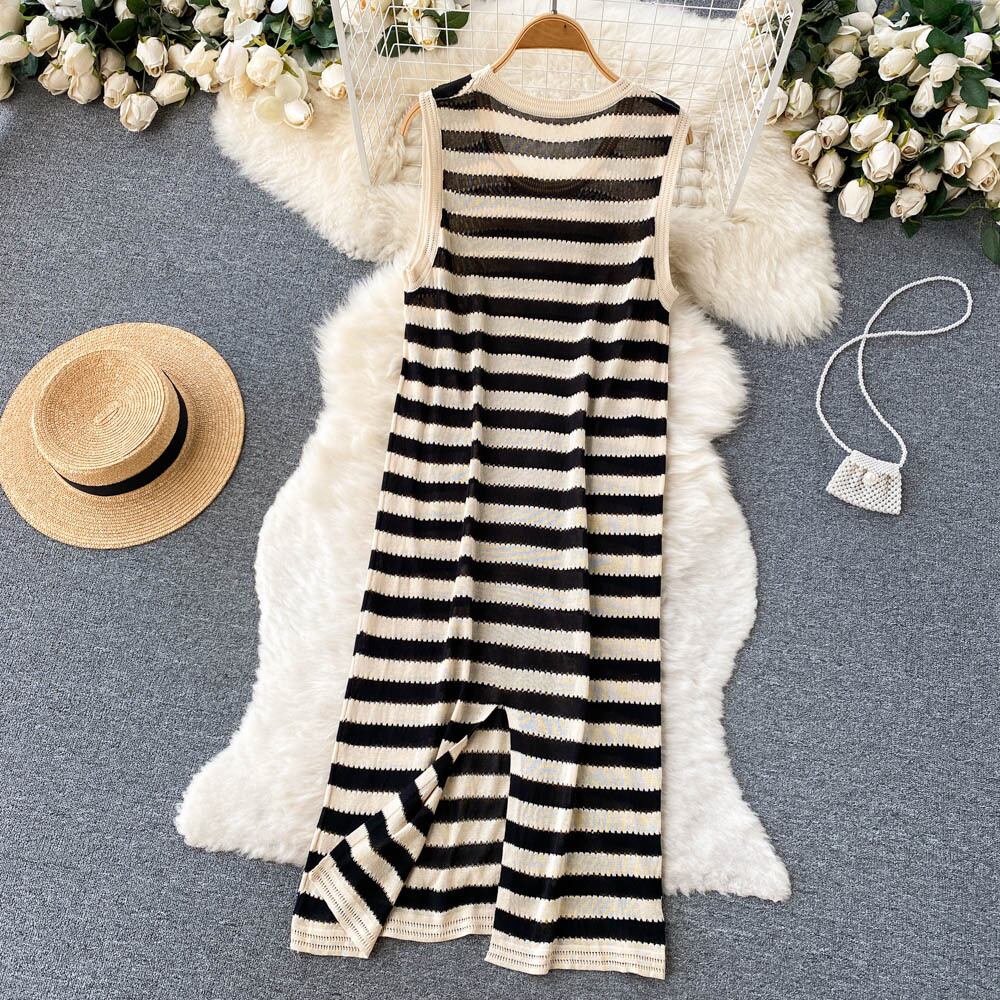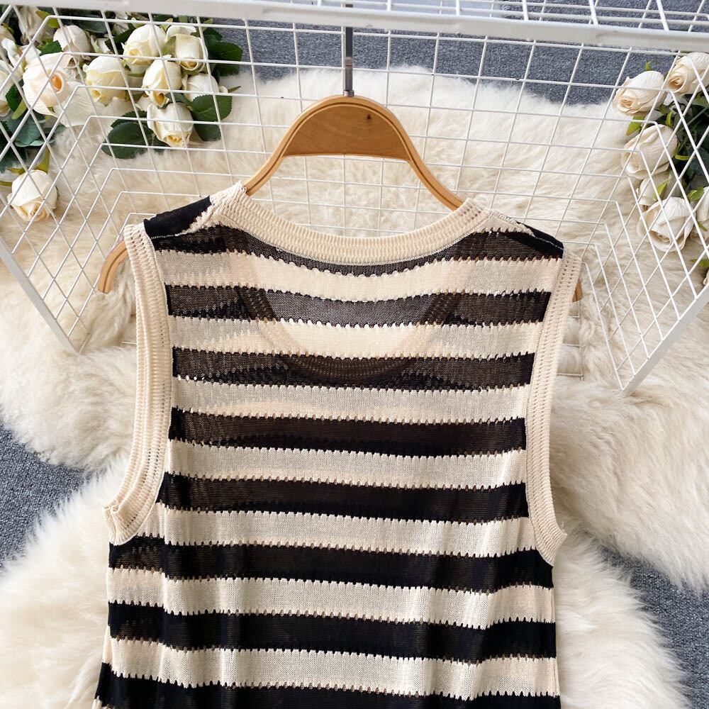 Summer new French niche loose and lazy wind thin hollow knitted vest ese striped dress women's tide サマー 夏物 ストライプ lyxaj71117051352